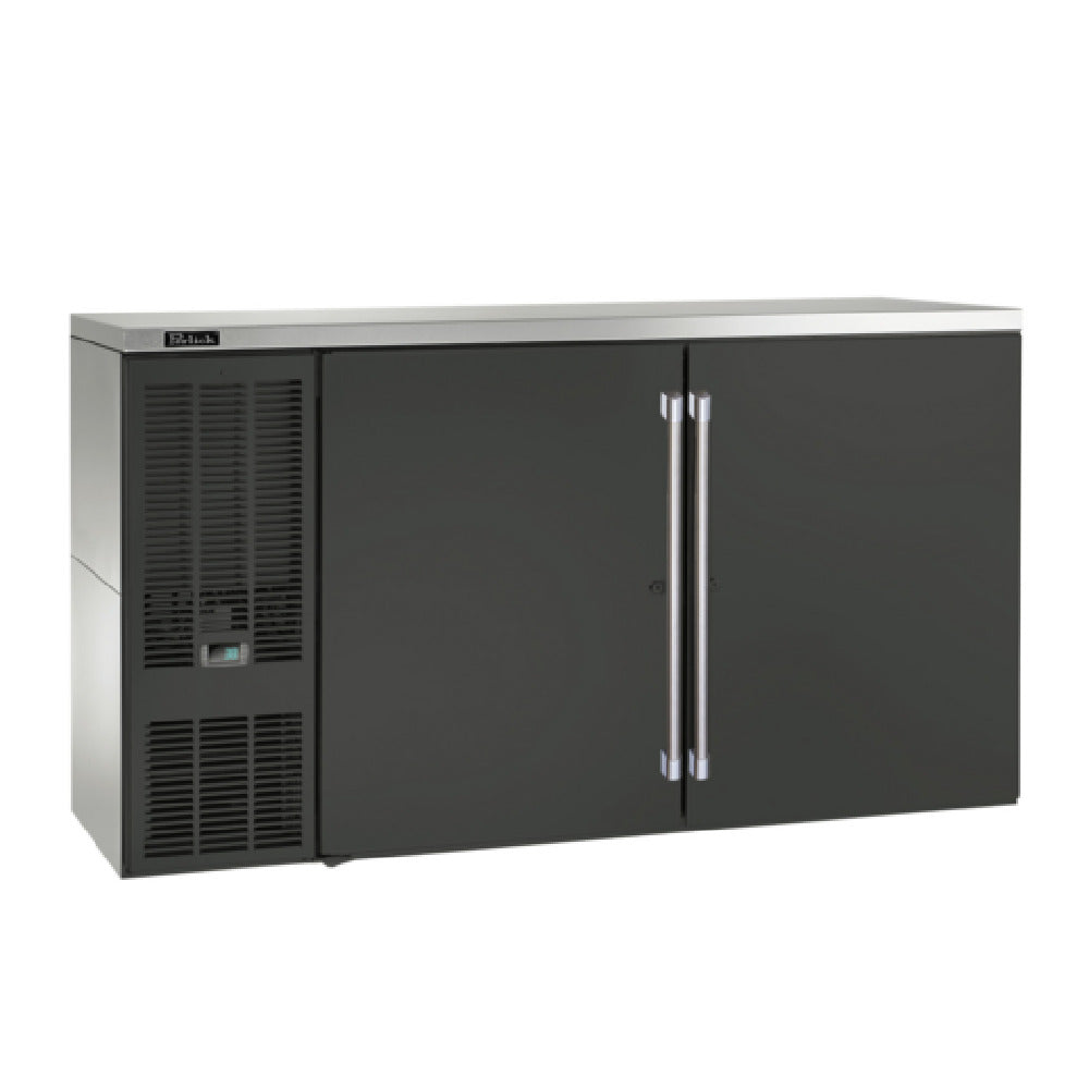 The Perlick BBS60-BS-L-STK (QuickShip) Refrigerated Back Bar Cabinet is a two-section unit measuring 60 inches in width, ideal for use in high-demand environments like bars and restaurants. Its self-contained refrigeration system provides an internal volume of 16 cubic feet, ensuring ample storage space for a variety of beverages. The cabinet's durable construction includes a stainless steel top and sides with a black vinyl-clad front, creating a sleek, modern look. It features two solid hinged doors equipped with locks, following a Left-Right hinge order for added security. Inside, the stainless steel interior is fitted with two vinyl-coated shelves and one floor shelf per section, offering flexible storage solutions. The digital thermostat and LED interior lighting enhance the usability and efficiency of the unit. Designed with a front-vented system, automatic defrost, and evaporator condensate features, it ensures optimal operational performance. The inclusion of a floor drain and use of R290 Hydrocarbon refrigerant highlight its environmentally conscious design. Powered by a 1/5 HP compressor, it meets NSF and cULus standards, making it a reliable choice for professionals seeking a balance of style, functionality, and sustainability in commercial refrigeration solutions.