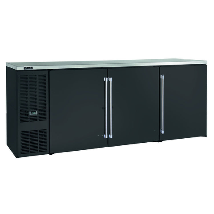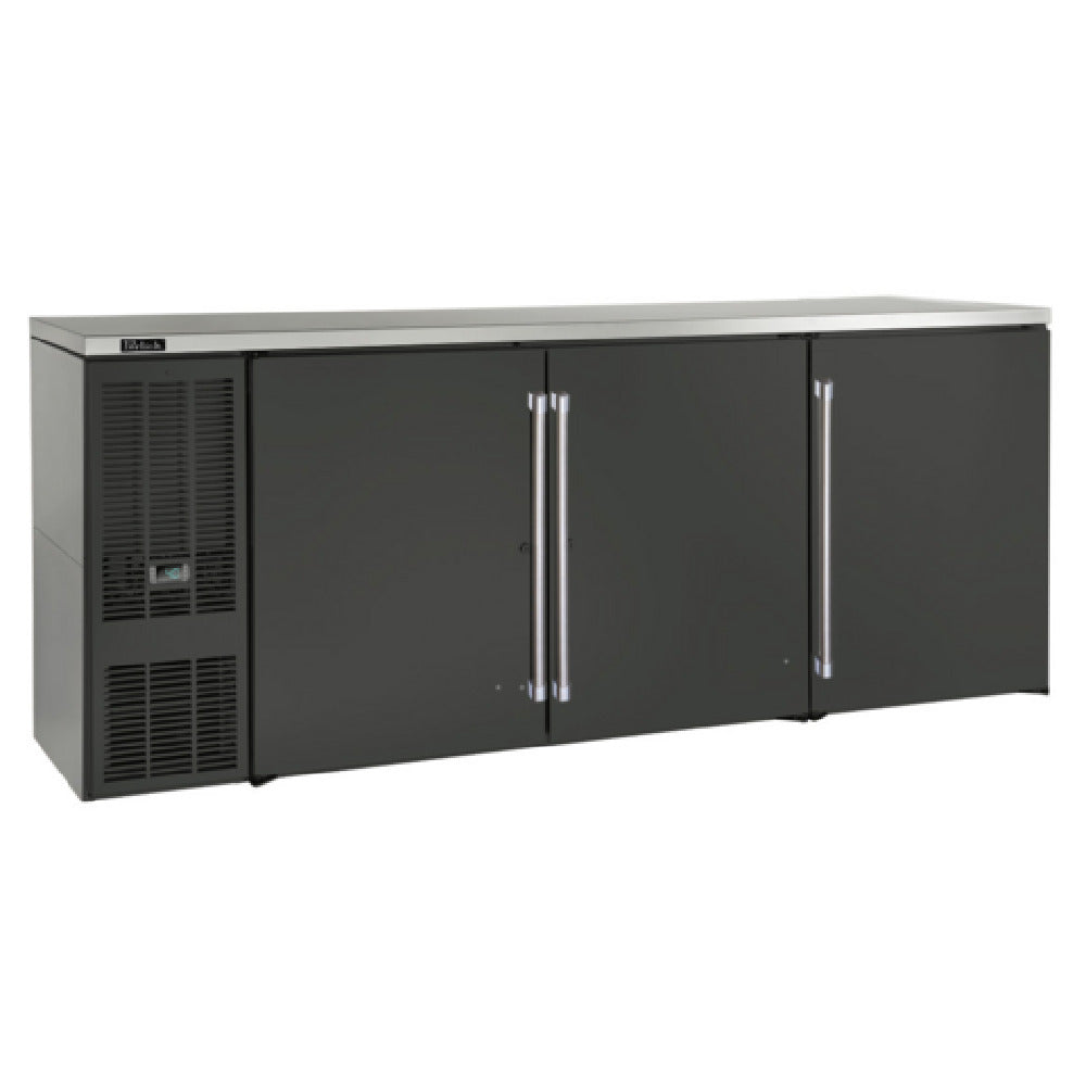 The Perlick BBS84-BS-L-STK (QuickShip) Refrigerated Back Bar Cabinet Three-section is a meticulously designed unit offering substantial storage capacity and advanced refrigeration technology suited for bar and restaurant environments. With an expansive width of 84 inches and an internal volume of 24.8 cubic feet, this cabinet is ideal for establishments requiring efficient beverage storage. It features a self-contained refrigeration system powered by a 1/4 HP compressor utilizing R290 Hydrocarbon refrigerant, ensuring eco-friendly and energy-efficient operation. The cabinet's exterior is adorned with a black vinyl clad front, while its interior boasts a stainless steel construction, enhancing durability and ease of cleaning. The design includes three solid hinged doors, two with left-hand hinges and one with a right-hand hinge, each equipped with locks for secure storage. Inside, each section provides two vinyl-coated shelves and a floor shelf, offering versatile storage options. The digital thermostat and LED interior lighting enhance user convenience, while the front-vented design, automatic defrost, and condensate evaporator ensure consistent performance. Additionally, the unit includes a floor drain and is NSF and cULus certified, affirming its compliance with strict standards and suitability for professional use in various market segments.