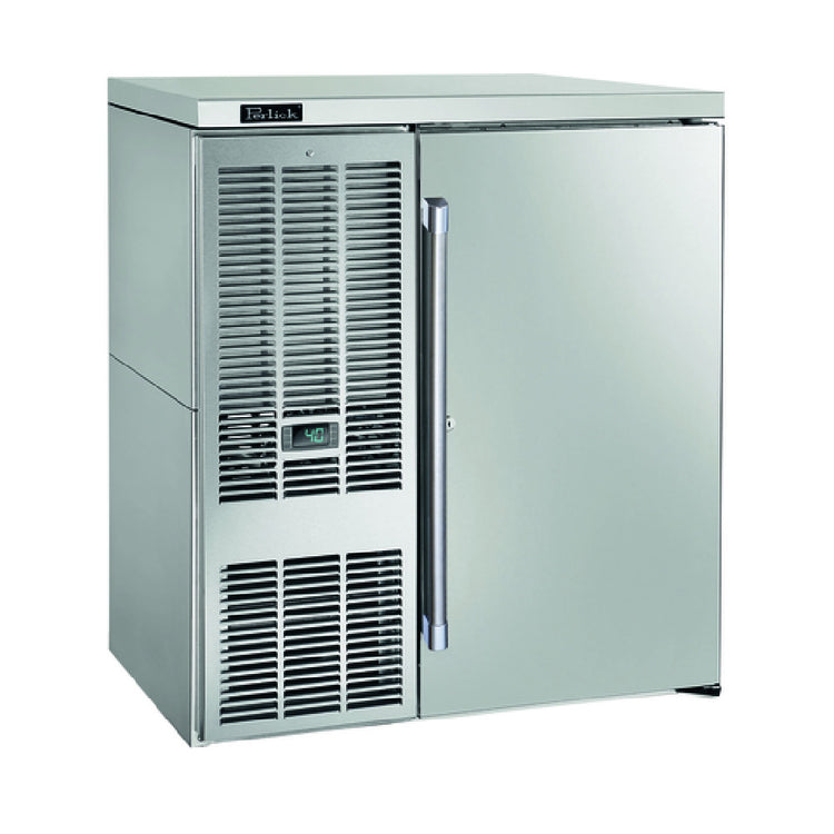 The Perlick BBSN32 Narrow Door Refrigerated Back Bar Cabinet - one-section, 32"W - is a refined refrigeration solution catering to diverse industry needs. This self-contained unit boasts a 6.0 cu.ft. interior volume, providing ample space for bar essentials while maintaining a compact footprint. The cabinet features a single hinged door complete with a lock, ensuring secure storage. The digital thermostat enables precise temperature control, complemented by LED interior lighting for enhanced visibility. Engineered for efficiency, the BBSN32 is front vented and includes automatic defrost and a condensate evaporator, eliminating manual maintenance tasks. The cabinet's design incorporates a floor drain and stainless steel interior, enhancing durability and ease of cleaning. The side-mounted compressor, powered by 1/6 HP, utilizes R290 Hydrocarbon refrigerant, aligning with eco-friendly standards. This refrigerated cabinet is NSF and cULus certified, assuring compliance with health and safety regulations. With its blend of advanced features and compact design, the Perlick BBSN32 is ideally suited for bars, restaurants, and hospitality venues seeking reliable and efficient refrigeration solutions.