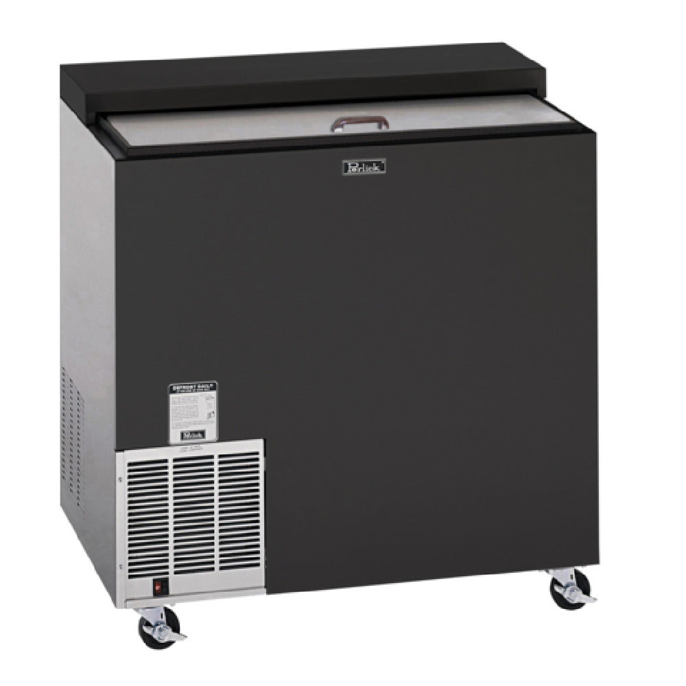 The Perlick FR36RT-3-BL_CAST Glass Froster Underbar 36"W is a high-performance refrigeration unit designed for commercial settings, specifically tailored for industries requiring rapid glass chilling. Featuring a self-contained refrigeration system, it operates within a temperature range of -10°F to 10°F, providing optimal conditions for glass frosting. Its interior offers 8.6 cubic feet of capacity, ensuring ample storage space. The unit is equipped with a dent-resistant stainless steel sliding door on top, complemented by sturdy die-cast handles, and includes a door frame heater to maintain efficiency in various environments. A manual defrost system, combined with a self-evaporating condensing pan, enhances maintenance simplicity. The froster boasts a stainless steel interior for durability and a sleek black vinyl-clad exterior that suits modern bar aesthetics. Powered by R290 refrigerant and a 1/4 HP compressor, it requires a 120v/60/1-ph electrical connection, drawing 3.8 amps, with a 6' cord ending in a NEMA 5-15P plug for easy installation. Certified by NSF and cULus, the unit meets rigorous safety and performance standards, making it a reliable choice for bars and restaurants seeking efficient and durable glass frosters. The Quick Ship feature ensures expedited delivery, catering to businesses with immediate needs.