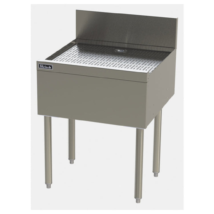 The Perlick TSF12DB TSF Series Underbar Drainboard - 12"W x 24"D is engineered with precision to meet the rigorous demands of the food and beverage industry. Featuring a pitched drainboard top, this unit facilitates efficient drainage, ensuring a clean and dry surface that is indispensable for maintaining hygiene and efficiency in fast-paced environments. Constructed entirely from stainless steel, the drainboard combines durability with a sleek appearance, making it a resilient and aesthetically pleasing addition to any bar setting. The inclusion of a backsplash provides an additional layer of protection against spills, safeguarding walls and workspaces. A standout feature is the Perlick Quick Clamp tool-less leg attachment, which allows for hassle-free assembly and adjustments. The robust stainless steel legs, equipped with adjustable thermoplastic feet, ensure stability on uneven surfaces, catering to various installation needs. This underbar drainboard is an excellent choice for bars, restaurants, and catering services looking to optimize their operations with reliable and easy-to-maintain equipment. Its adaptable design and high-grade materials underscore its potential to serve diverse market segments, from high-volume commercial establishments to intimate bar settings, delivering consistent performance and enduring quality.