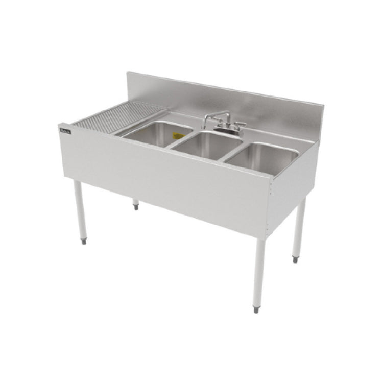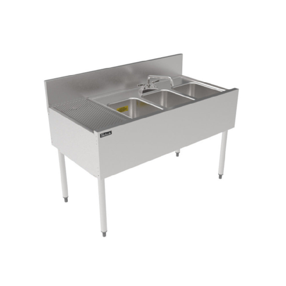 The Perlick TSF48M3-DBL TSF Series Underbar Multi-tank Sink Unit is a meticulously engineered solution designed to meet the diverse needs of commercial establishments. Constructed with three 18-gauge stainless steel compartments, each measuring 10" wide x 14" front-to-back x 9-1/4" deep, this sink unit offers robust durability and ample space for various tasks. The unit spans 48"W x 24"D, making it a substantial addition to any professional setting. For added efficiency, it includes a 12" pitched drainboard top on the left, facilitating effective water management. Key technical features include 4" OC splash or TSF deck mount faucet holes and a seamless 18-gauge stainless steel front apron. Additionally, the unit is equipped with 1-1/2" drains and 8-1/2" removable overflow standpipes, ensuring optimal drainage and overflow management. Its advanced design incorporates the Perlick Quick Clamp tool-less leg attachment system, complemented by stainless steel legs with adjustable thermoplastic feet, enhancing stability and adaptability in various environments. This sink unit's comprehensive stainless steel construction not only ensures longevity but also supports high standards of hygiene, making it an ideal choice for bars, restaurants, and other food service operations seeking reliable and efficient underbar sink solutions.