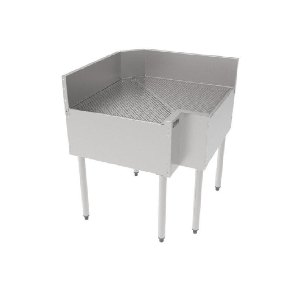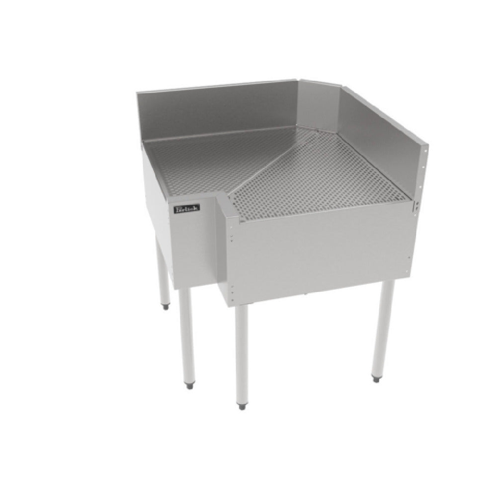 The Perlick TSF90D-FI TSF Series Underbar Inside Corner Drainboard is a meticulously engineered piece designed to enhance the functionality and efficiency of bar setups. Featuring a 90-degree angle full corner design, this drainboard seamlessly maximizes underbar space, making it particularly valuable for bars and restaurants aiming to optimize their layouts. The pitched drainboard top ensures effective drainage, complemented by a 1-1/2" drain, facilitating superior liquid management and sanitation. Constructed entirely from stainless steel, its robust and durable build ensures longevity and resistance to corrosion, crucial for high-traffic environments. An integrated backsplash offers additional protection against spills, maintaining a cleaner workspace. The innovative Perlick Quick Clamp tool-less leg attachment system enhances the ease of assembly, saving valuable time during installation or reconfiguration. Stainless steel legs with adjustable thermoplastic feet provide stability and adaptability to uneven surfaces, ensuring a sturdy setup. Perfect for establishments in the hospitality industry, this drainboard combines functionality, durability, and ease of maintenance, making it a strategic choice for bars aiming to improve service efficiency and maintain high cleanliness standards.