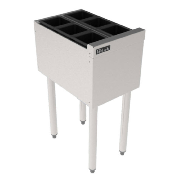 The Perlick TSS12U2 TSS Series Underbar Bottle Storage Bin - Insulated 12"W x 24"D is a specialized storage solution that caters to the needs of bars and beverage service areas requiring efficient bottle organization. This island-type bin is meticulously crafted with stainless steel construction, offering a blend of durability and sleek aesthetics suitable for high-traffic environments. With dimensions of 12 inches in width and 24 inches in depth, this storage bin integrates seamlessly into compact underbar spaces, optimizing the use of available area. It features six bottle wells, providing a designated area for bottle storage that ensures easy access and organization, enhancing service efficiency. The insulation feature of the Perlick TSS12U2 not only maintains ideal temperature conditions for the stored bottles but also contributes to energy savings, making it an asset for energy-conscious businesses. This product is particularly beneficial for establishments looking to maximize their storage capabilities without compromising on quality or space efficiency. The Perlick TSS12U2 embodies a combination of practicality and robust design, making it a versatile solution for various market segments within the hospitality industry, from upscale bars to casual dining settings. Its distinct features highlight its role as a reliable component in beverage service operations.