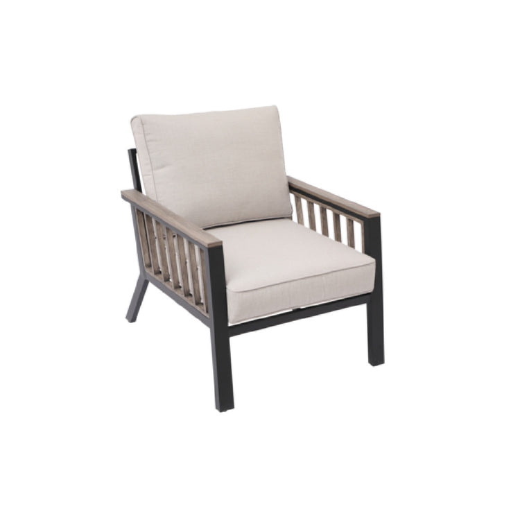 Plantation Prestige Commercial Furniture LLC, 8820600-0140433, Telluride Lounge Chair, matte black finish, barnwood arm slats, barnwood aluminum side slats, Sunbrella #40433 Cast Silver seat/back cushion (other fabric options available for upcharge)