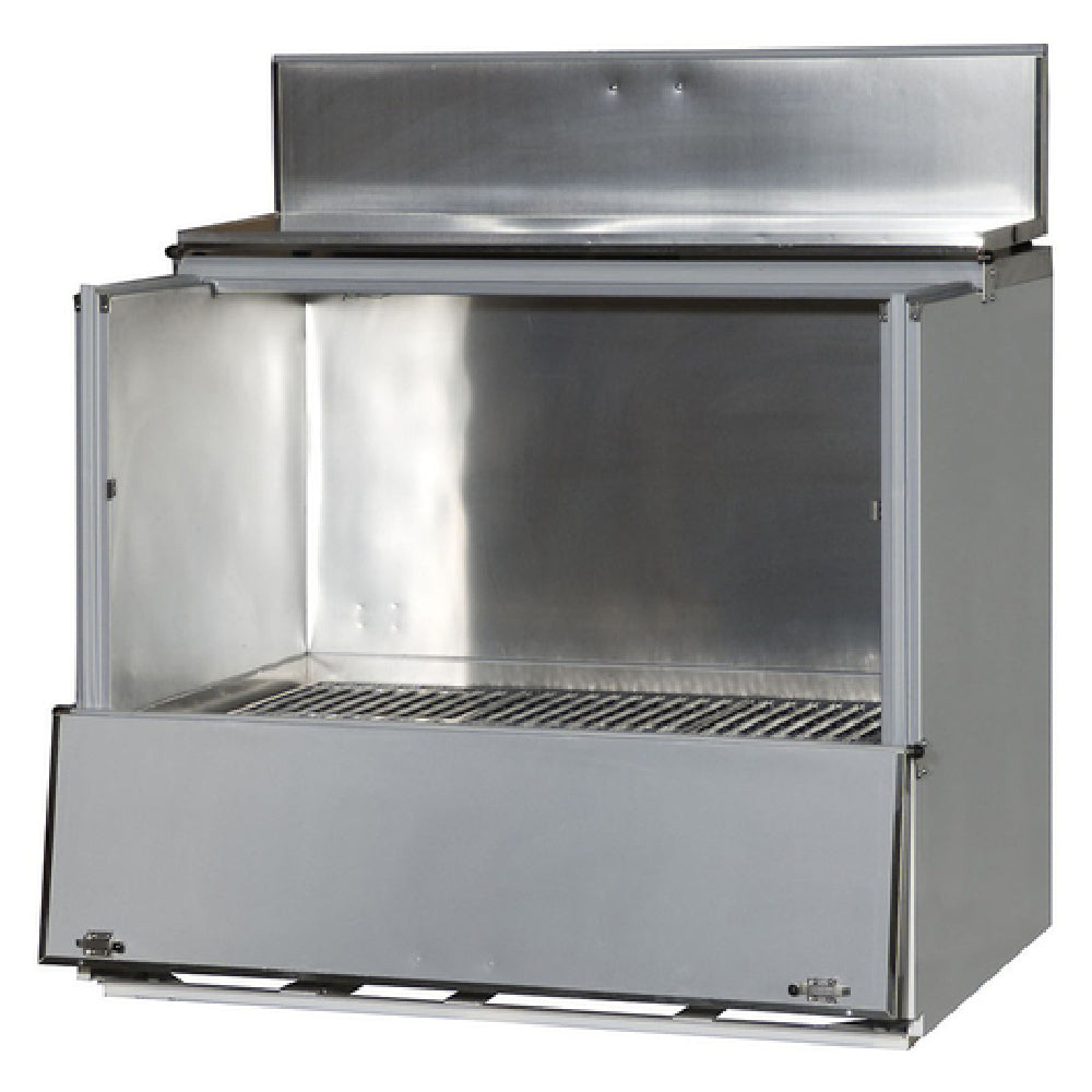 Powers, 569, Milk Case Cooler, single access, 47"W, 16.7 cu. ft. capacity, (12) 13" x 13" case capacity, (3) bottom racks, (1) fold down door with flip top lid, bottom drain, stainless steel hinges, latches, top & lid, aluminum interior, white powder coat exterior, 4" casters, self-contained, R290 Hydrocarbon refrigerant, 1/5 HP, 115v/60/1-ph, 3.7 amps, NEMA 5-15P, ETLus, ETL-Sanitation, Made in USA