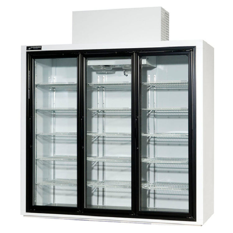Powers, BT77LGD, Beverage Cooler, three-section, 77"W, 72.0 cu. ft. capacity, top mount self-contained refrigeration, (3) sliding glass doors, (15) adjustable coated wire shelves, electronic temperature control, LED interior lighting, stainless steel floor, powder coat exterior, 1/2+ HP, 115v/60/1-ph, 17.0 amps, Made in USA