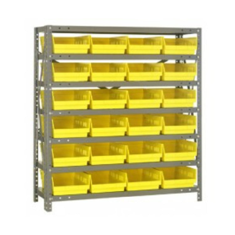 The Quantum 1239-107 Shelving Unit is a heavy-duty storage solution, precisely measuring 12"D x 36"L x 39"H. This robust unit stands out in various industry segments due to its exceptional load capacity, supporting up to 400 lb. per shelf, which makes it suitable for storing heavy items in industrial, commercial, or everyday settings. The shelving unit includes seven shelves, providing ample space for organized storage. Additionally, it comes with 24 bins measuring 11-5/8"L x 8-3/8"W x 4"H (model QSB107), available in multiple colors, catering to different organizational needs and aesthetic preferences. The inclusion of uprights and cross bars enhances structural integrity, ensuring stability and durability in demanding environments. The galvanized steel finish not only adds a sleek appearance but also provides resistance against corrosion, extending the lifespan of the unit. This shelving unit is designed for adaptability, making it a versatile choice for warehouses, garages, retail spaces, and other storage applications where robust and reliable shelving is essential. Its thoughtful construction and high load capacity make the Quantum 1239-107 Shelving Unit a reliable and long-lasting investment for diverse storage needs.