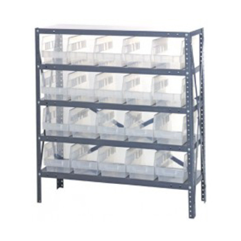 The Quantum 1239-202CL Shelving Unit 12"D X 36"L X 39"H Heavy Duty is engineered for robust storage solutions across various industry sectors requiring durable and reliable shelving. This shelving unit stands out with its impressive load capacity, supporting up to 400 lbs per shelf, making it ideal for environments with significant storage demands. It features five sturdy shelves, each capable of accommodating heavy items with ease, enhancing organizational efficiency. The unit includes twenty clear bins measuring 11-5/8"L x 6-5/8"W x 6"H (QSB202), allowing for transparent and accessible item storage. Constructed from galvanized steel, it promises longevity and resistance to corrosion, which is crucial in industrial settings. The dimensions of 12"D x 36"L x 39"H are meticulously designed to optimize space utilization while providing ample storage capacity. With the inclusion of uprights and cross bars, the unit's structural integrity is maintained, ensuring stability even under maximum load. The Quantum 1239-202CL is suitable for various market segments, including warehouses, retail backrooms, and even personal garages, offering a versatile and practical storage solution that meets the rigorous demands of heavy-duty applications.