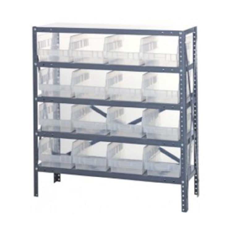 The Quantum 1239-207CL Shelving Unit 12"D X 36"L X 39"H Heavy Duty is expertly designed to meet the rigorous demands of industrial environments, providing superior storage solutions. This shelving unit features a substantial 400 lb. load capacity per shelf, making it ideal for storing heavy equipment, tools, or materials in various settings such as warehouses, workshops, and factories. The unit includes five shelves, which are complimented by sixteen clear bins measuring 11-5/8"L x 8-3/8"W x 6"H (QSB202), allowing for organized and easy access to stored items. The structural integrity of the unit is ensured by its galvanized steel finish, offering enhanced durability and resistance to corrosion. The incorporation of uprights and cross bars further reinforces the stability of the shelving unit, making it a reliable choice for heavy-duty storage needs. Its dimensions of 12 inches in depth, 36 inches in length, and 39 inches in height provide a compact yet spacious solution for maximizing storage capacity in limited spaces. The Quantum 1239-207CL Shelving Unit is an invaluable addition to any business requiring robust, long-lasting storage options, tailored to accommodate the distinct challenges of the industrial sector.