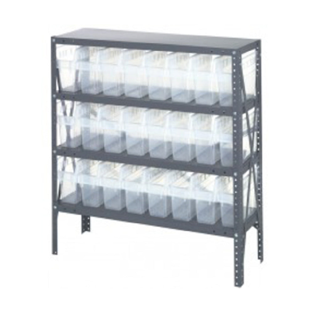 The Quantum 1239-SB801CL Shelving Unit 12"D x 36"L x 39"H is a heavy-duty storage solution designed for efficient and organized storage needs across various industry sectors. This robust shelving unit features a galvanized steel finish, ensuring durability and resistance to corrosion. With a load capacity of 400 lb. per shelf, it is built to support heavy items securely. The shelving unit includes four shelves, offering ample space for diverse storage requirements. Additionally, it comes equipped with 24 clear bins, each measuring 11-5/8"L x 4-3/8"W x 8"H, designated as QSB801, which facilitate easy visibility and access to stored contents. The inclusion of uprights and cross bars further enhances the stability and structural integrity of the unit. Suitable for warehouses, workshops, and commercial environments, the Quantum 1239-SB801CL Shelving Unit provides a blend of functionality and strength, making it an excellent choice for those seeking reliable and practical storage solutions. Its thoughtful design and comprehensive capacity cater to the needs of professionals who require organized and efficient storage systems without compromising on quality and durability.