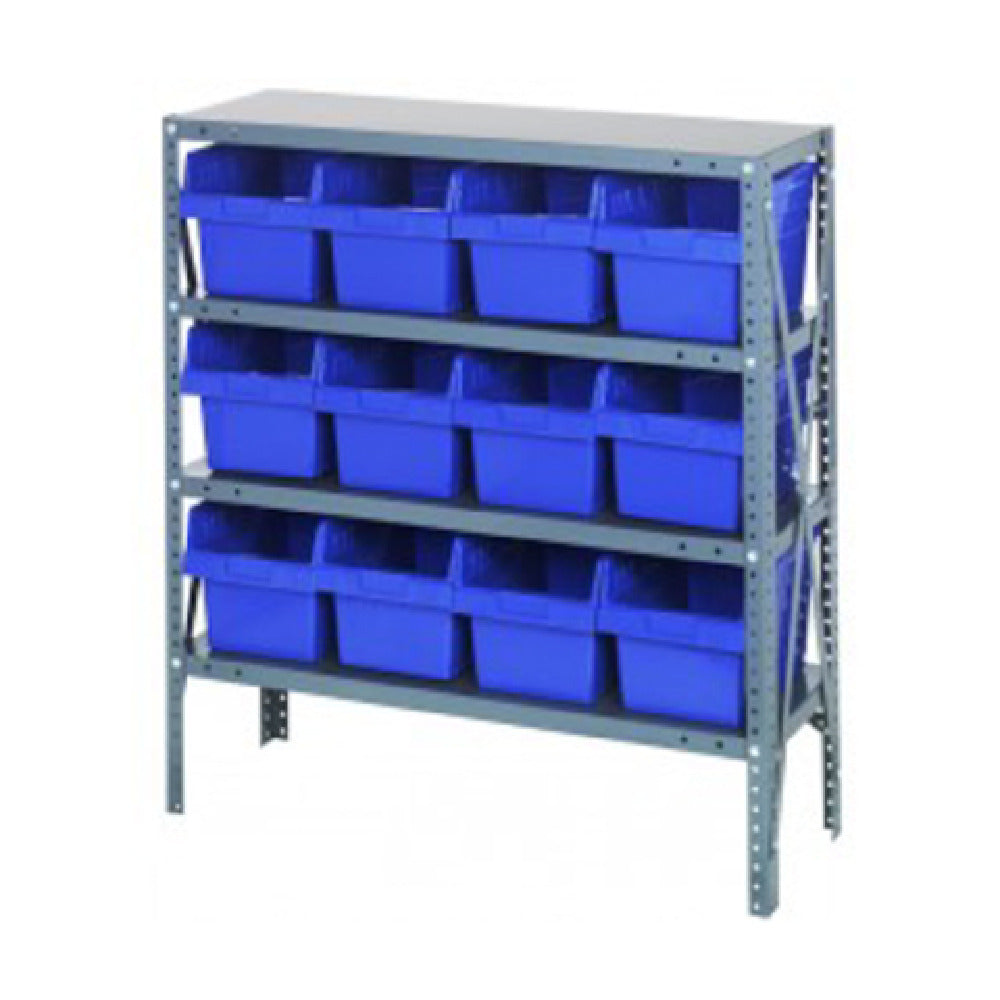 The Quantum 1239-SB807 Shelving Unit is a heavy-duty storage solution measuring 12"D x 36"L x 39"H, expertly crafted to meet high-capacity industrial demands. Engineered with a robust galvanized steel finish, it ensures long-lasting durability and resilience in diverse environments. Each of the four shelves boasts an impressive 400 lb. load capacity, accommodating a wide array of storage needs, from bulky items to numerous smaller components. Accompanying these shelves are twelve QSB807 bins, each measuring 11-5/8"L x 8-3/8"W x 8"H, designed to optimize organization and efficiency within any workspace. These bins are available in multiple colors, offering customizable storage options that cater to various organizational systems. The shelving unit is supported by sturdy uprights and cross bars, ensuring structural integrity and stability. This Quantum shelving unit is a versatile solution suitable for warehouses, workshops, or retail settings, providing exceptional storage capabilities with a focus on reliability and efficient space utilization.