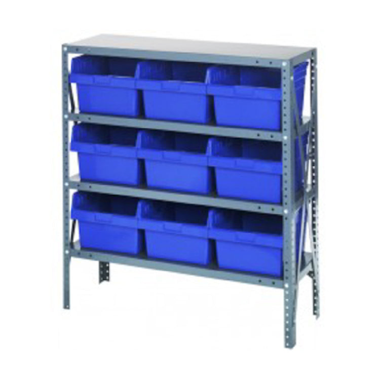 The Quantum 1239-SB809 Shelving Unit 12"D x 36"L x 39"H Heavy Duty is designed for industrial and commercial storage needs, providing exceptional strength and versatility. Engineered with galvanized steel, this shelving unit ensures durability and long-lasting performance. Each shelf boasts a remarkable 400 lb. load capacity, making it ideal for storing heavy equipment or inventory. The unit includes four sturdy shelves supported by robust uprights and cross bars, providing a stable and reliable structure. Accompanying the shelves are nine bins, each measuring 11-5/8"L x 11-1/8"W x 8"H (QSB809), offering convenient organization for smaller items. These bins are available in multiple colors, allowing customization to suit specific organizational needs or aesthetic preferences. The dimensions of the unit, 12 inches in depth, 36 inches in length, and 39 inches in height, make it a compact yet spacious solution suitable for various spaces, from warehouses to retail environments. This shelving unit's heavy-duty construction and versatile design cater to diverse market segments seeking efficient and reliable storage solutions, emphasizing capacity and durability for industrial applications. Its technical specifications and modular features provide practical and flexible options for optimizing storage efficiency.