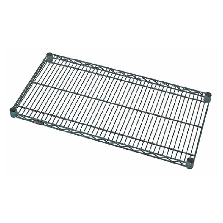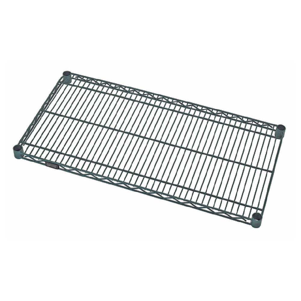 The Quantum 1260P Wire Shelf 60"W x 12"D is a high-capacity storage solution, capable of supporting loads ranging from 600 to 800 pounds. This makes it an ideal choice for various industries that require robust shelving, such as warehousing, retail, or food service establishments. The shelf is finished with a green epoxy antimicrobial coating, providing an added layer of protection against bacteria and ensuring compliance with hygiene standards, a crucial feature for environments like restaurants or healthcare facilities. Its NSF certification further attests to its suitability in settings that demand stringent health and safety regulations. The dimensions of 60 inches in width and 12 inches in depth offer ample space for organizing goods, while its wire construction promotes air circulation, reducing dust accumulation and maintaining product integrity. This Quantum wire shelf combines durability, safety, and practicality, making it a versatile asset for any business seeking efficient storage solutions.