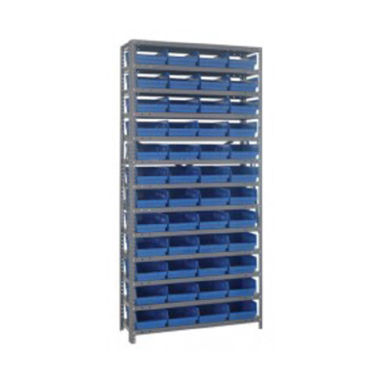 The Quantum 1275-107 Shelving Unit is a heavy-duty storage solution designed for a variety of industrial applications. With dimensions of 12"D x 36"L x 75"H, this robust shelving unit is crafted to support up to 400 lb. per shelf, accommodating a wide range of storage needs. The unit includes 13 durable shelves, making it a versatile choice for warehouses, workshops, or retail environments. Each unit also comes equipped with 48 bins, each measuring 11-5/8"L x 8-3/8"W x 4"H (QSB107), available in multiple colors to fit organizational preferences. The shelves and bins are supported by sturdy uprights and cross bars, ensuring stability and long-lasting performance. The entire unit features a galvanized steel finish, providing resistance to rust and corrosion, which is crucial in demanding environments where durability is paramount. This shelving unit is ideal for industries requiring efficient space utilization and high load capacities, such as manufacturing, logistics, or wholesale distribution. The Quantum 1275-107 Shelving Unit offers a practical, heavy-duty storage solution that caters to varied industrial needs while ensuring reliable organization and easy access to stored items.
