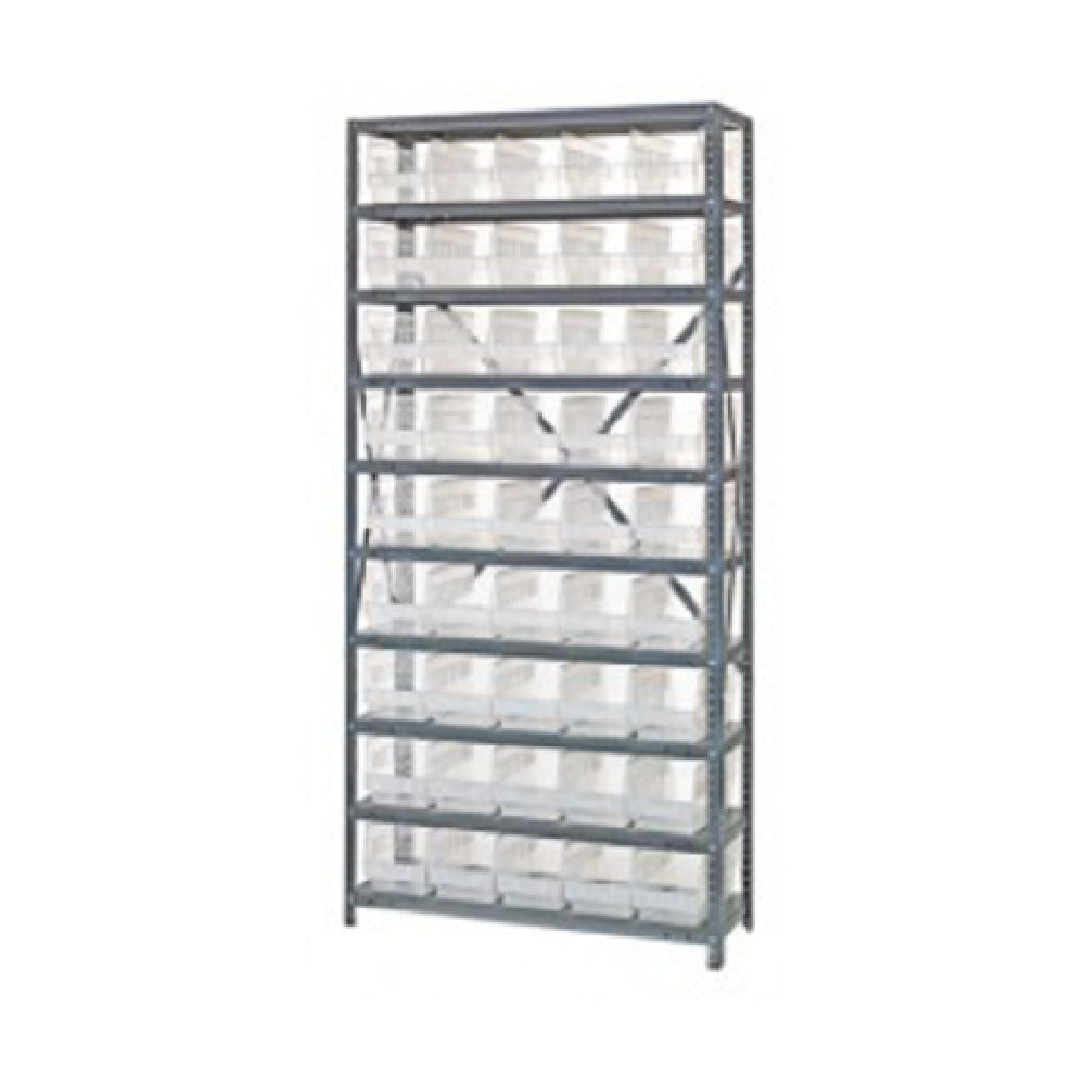 The Quantum 1275-202CL Shelving Unit 12"D X 36"L X 75"H Heavy Duty is engineered for both durability and versatility, accommodating various storage needs with its robust design. Each of its ten shelves is capable of supporting up to 400 lbs, making it suitable for heavy-duty applications in warehouses, workshops, or commercial storage environments. The shelving unit comes with 45 clear bins, each measuring 11-5/8"L x 6-5/8"W x 6"H, designated as QSB202 bins, providing organized and easily accessible storage solutions. Crafted from galvanized steel, the unit promises enhanced durability and resistance to corrosion, ideal for long-term use in demanding settings. The inclusion of uprights and cross bars provides structural stability, ensuring that the shelves remain securely in place under load. The Quantum 1275-202CL stands at an impressive 75 inches tall, offering ample vertical storage space while its 36-inch length and 12-inch depth make it a compact yet efficient storage solution. This shelving unit presents a highly effective organizational system for professionals across various industries, including manufacturing, retail, or logistics, who require reliable and space-efficient storage with clear visibility and access to stored items.