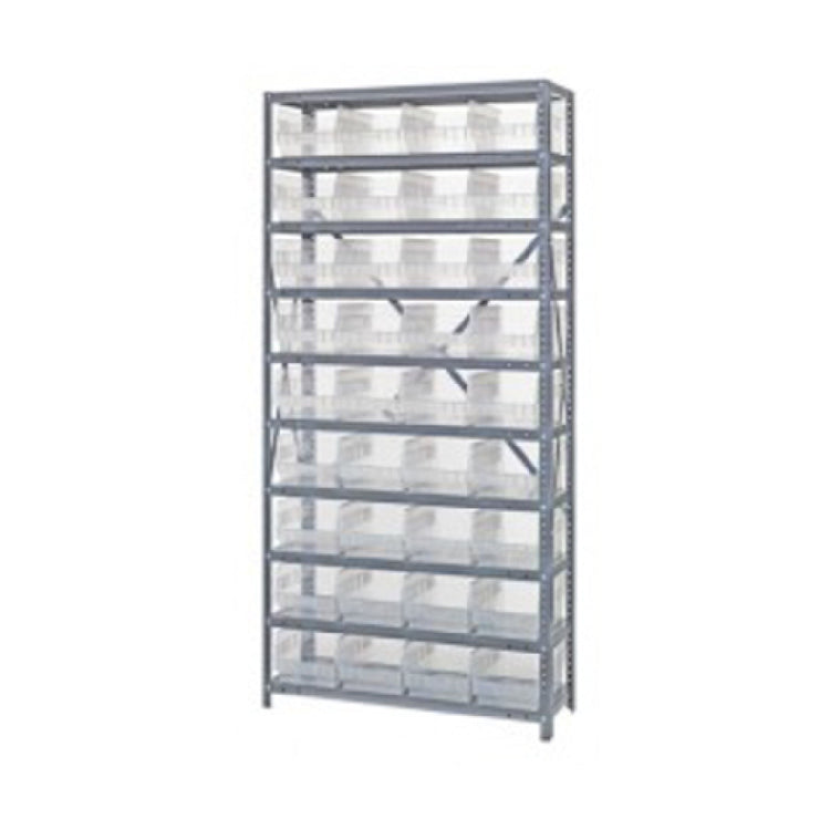 The Quantum 1275-207CL Shelving Unit 12"D X 36"L X 75"H Heavy Duty is a robust storage solution designed for demanding environments that require reliable and efficient organization. With a heavy-duty construction, each shelf boasts a remarkable load capacity of 400 lbs, making it ideal for industries that need to store heavy materials or equipment. The shelving unit includes 10 shelves, providing ample storage space for various items. Additionally, it features 36 clear bins, each measuring 11-5/8"L x 8-3/8"W x 6"H, which are perfect for categorizing and accessing smaller components or tools with ease. The unit's uprights and cross bars add to its stability and durability, ensuring long-term performance. Finished with galvanized steel, this shelving unit is resistant to corrosion, making it suitable for use in different industrial settings, including workshops, warehouses, and manufacturing facilities. The Quantum 1275-207CL's thoughtful design and high load capacity make it an indispensable asset for businesses looking to improve their storage efficiency and organization. Whether used in a commercial or industrial context, this shelving unit stands out for its functional design and robust build quality.