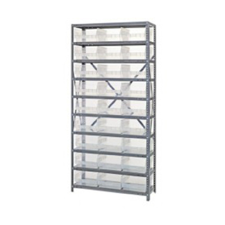 The Quantum 1275-209CL Shelving Unit is a heavy-duty storage solution meticulously designed for robust applications, with each of its ten shelves supporting a load capacity of 400 lbs. This makes it particularly suitable for industries requiring reliable storage of substantial goods. Measuring 12 inches deep, 36 inches long, and 75 inches high, the unit provides ample vertical storage space while maintaining a compact footprint. It is composed of galvanized steel, offering enhanced durability and resistance against corrosion, making it an excellent choice for environments that demand sturdy and long-lasting storage solutions. Included with the shelving unit are twenty-seven clear bins, each measuring 11-5/8 inches long, 11-1/8 inches wide, and 6 inches high, facilitating organized storage with visibility of contents. The unit's uprights and cross bars ensure structural stability, further underscoring its capacity to handle heavy-duty tasks. This shelving unit is ideally suited for use in warehouses, distribution centers, and various industrial settings where high-capacity and organized storage is crucial. Its thoughtful design allows for efficient use of space, providing a practical and reliable solution for businesses looking to optimize their storage capabilities with a focus on durability and functionality.