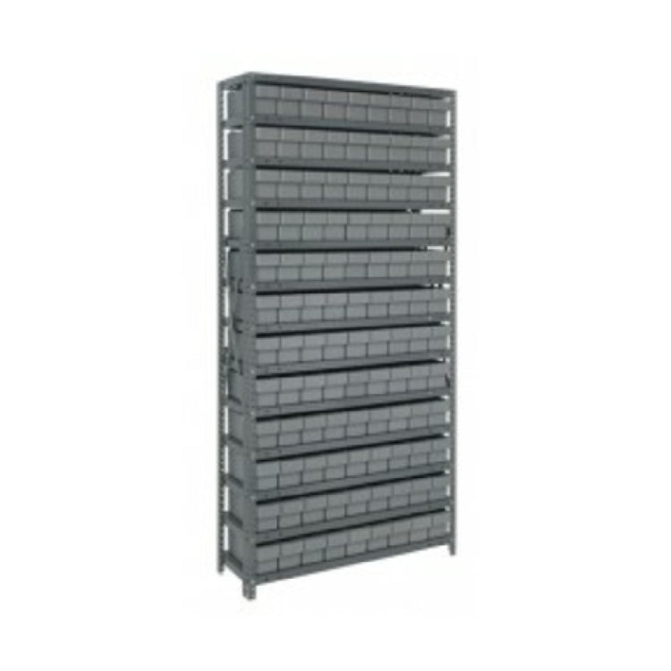 The Quantum 1275-501 Shelving Unit, measuring 12"D x 36"L x 75"H, is engineered for heavy-duty applications, boasting a robust load capacity of 400 lb. per shelf. This meticulously designed unit comprises 13 shelves, providing extensive storage solutions for various industries. Accompanying this shelving are 108 bins, each measuring 11-5/8"L x 3-3/4"W x 4-5/8"H (model QED501), available in multiple colors, enhancing organizational capabilities. Constructed with a galvanized steel finish, the Quantum 1275-501 offers both durability and resistance to corrosion, making it an ideal choice for demanding environments such as warehouses, retail spaces, or workshops. The inclusion of uprights and cross bars in its design further reinforces its stability and versatility, catering to a wide range of storage needs. Whether used in industrial settings for storing heavy equipment or in commercial environments for organizing inventory, the Quantum 1275-501 Shelving Unit delivers dependable performance and adaptability. Its thoughtful construction ensures longevity, meeting the rigorous demands of dynamic storage requirements across various market segments that necessitate reliable and efficient shelving solutions.