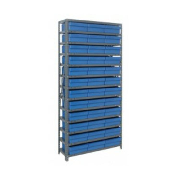 The Quantum 1275-801 Shelving Unit is a meticulously engineered storage solution, characterized by its 12"D x 36"L x 75"H dimensions, making it suitable for a wide range of industrial uses. With a heavy-duty framework, each shelf holds an impressive load capacity of 400 lb., ensuring durability and stability for various storage requirements. This unit includes 13 robust shelves, perfect for maximizing vertical space. Additionally, it features 36 QED801 bins, each measuring 11-5/8"L x 11-1/8"W x 4-5/8"H, available in multiple colors to facilitate efficient organization and identification of stored items. The unit's uprights and cross bars, paired with a galvanized steel finish, provide enhanced resistance against corrosion, making it ideal for settings that require durable and long-lasting storage solutions. This shelving unit is a versatile choice for industries such as warehousing, manufacturing, and retail, where robust and efficient storage systems are critical. Its strategic design and solid construction offer a balance of strength and adaptability, supporting diverse organizational needs within different market segments. Whether used for bulky equipment or smaller components, the Quantum 1275-801 Shelving Unit stands out as a reliable and practical choice for optimizing storage efficiency and reliability.