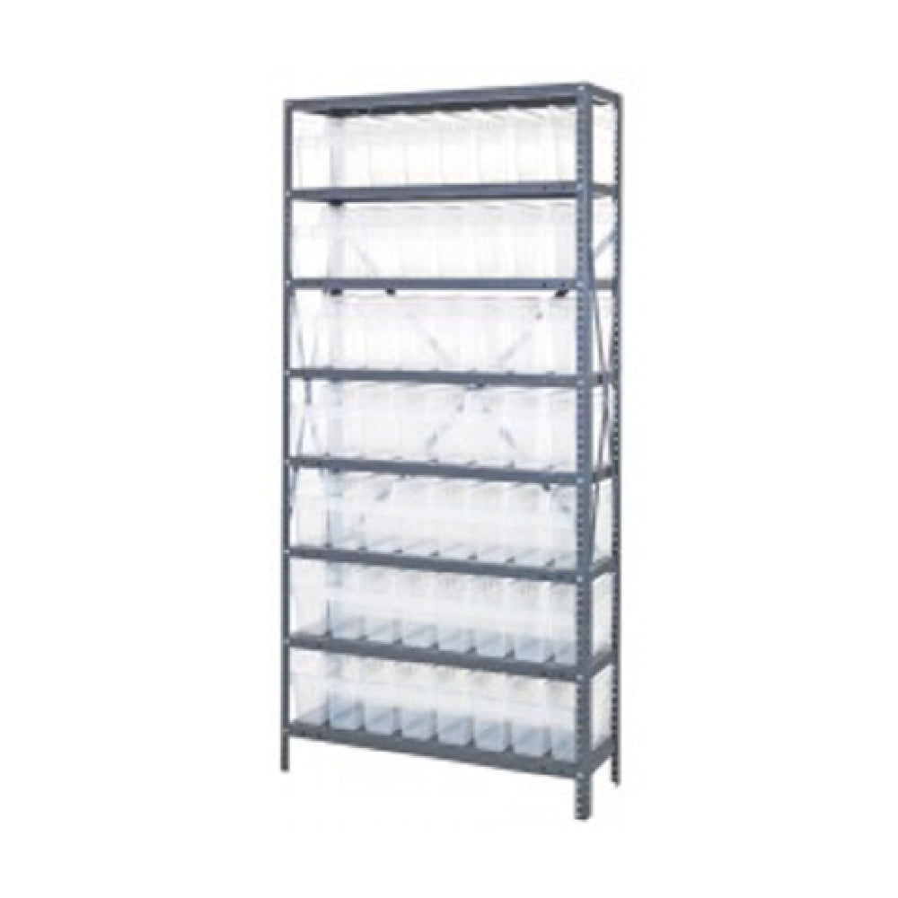The Quantum 1275-SB801CL Shelving Unit, measuring 12" in depth, 36" in length, and 75" in height, is a heavy-duty storage solution designed to meet the rigorous demands of various industries. Each of its eight shelves boasts an impressive 400 lb. load capacity, offering robust support for storing a wide array of items securely. The shelving unit includes 56 clear bins, each measuring 11-5/8" in length, 4-3/8" in width, and 8" in height (QSB801), providing easy visibility and organization of stored contents. Constructed with galvanized steel, this shelving unit ensures durability and longevity, making it suitable for environments requiring reliable storage solutions. The incorporation of uprights and cross bars further enhances its stability, allowing it to withstand heavy use. This versatile shelving unit is ideal for warehouses, retail operations, manufacturing plants, and other professional settings where efficient storage and organization are paramount. Its clear bins and sturdy construction make it an invaluable asset for improving workflow and accessibility in any space. The Quantum 1275-SB801CL Shelving Unit is thoughtfully designed to deliver dependable performance, supporting various storage needs across multiple sectors with its precise engineering and durable materials.