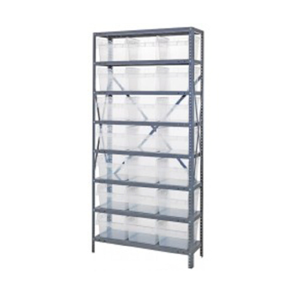 The Quantum 1275-SB809CL Shelving Unit is a heavy-duty storage solution engineered for various industrial applications, measuring 12 inches deep, 36 inches long, and 75 inches high. Each shelf is designed to support a remarkable weight capacity of up to 400 pounds, ensuring robustness and reliability for storing heavy goods. The unit includes eight sturdy shelves, offering ample space for organized storage. In addition, the package comprises 21 clear bins, each measuring 11-5/8 inches in length, 8-3/8 inches in width, and 8 inches in height, identified as model QSB809. The bins provide a clear view of the contents for easy identification and access. The shelving unit is further reinforced with durable uprights and cross bars, enhancing its structural integrity. Its galvanized steel finish not only adds a layer of protection against corrosion but also enhances its aesthetic appeal, making it suitable for various professional environments. This shelving unit is a functional and versatile storage solution, catering to warehouses, manufacturing facilities, and commercial spaces requiring efficient organization and accessibility of materials. Its robust design and thoughtful configuration make it a valuable asset for maintaining order and optimizing space in demanding settings.