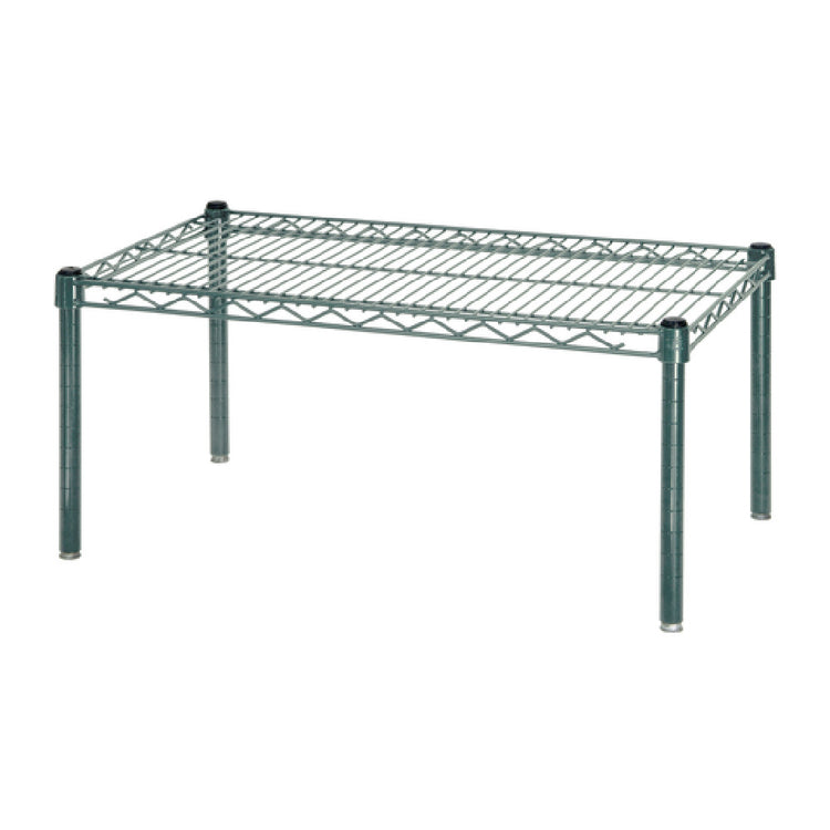The Quantum 183614PP Platform Rack is a versatile storage solution engineered for both durability and efficiency, measuring 36"W x 18"D x 14"H. This platform rack is capable of supporting an impressive weight capacity of 600 - 800 lbs, making it suitable for a variety of industrial and commercial applications where heavy loads are commonplace. Its green epoxy antimicrobial finish not only provides a robust layer of protection against rust and corrosion but also contributes to maintaining high hygiene standards by inhibiting the growth of bacteria and other microorganisms. This makes the Quantum 183614PP an ideal choice for environments such as food service, healthcare, and cleanrooms, where cleanliness is paramount. The platform's dimensions allow it to fit into compact spaces while still offering ample storage capacity, making it a practical solution for optimizing storage in warehouses, distribution centers, and manufacturing facilities. Its sturdy construction ensures reliable performance under demanding conditions, providing users with a dependable platform for organizing and accessing stock or equipment efficiently. The Quantum 183614PP Platform Rack stands out as a reliable and hygienic storage option that meets the diverse needs of various industries, combining strength, practicality, and antimicrobial protection.