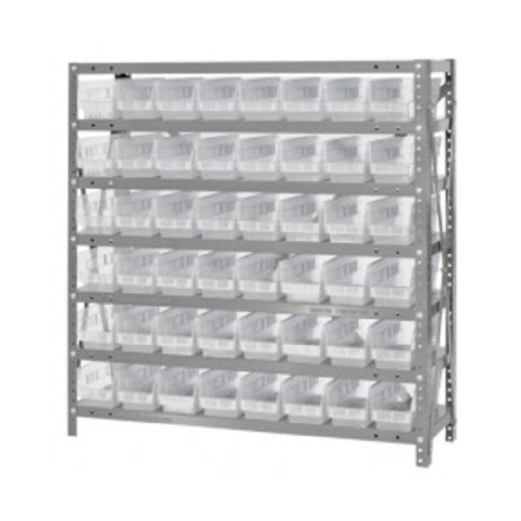 The Quantum 1839-103CL Shelving Unit is a heavy-duty storage solution engineered for industrial efficiency and adaptability. With dimensions of 18"D x 36"L x 39"H, this shelving unit is designed to maximize storage in compact spaces, making it suitable for various commercial environments. Each of its seven shelves boasts a formidable 400 lb. load capacity, offering a reliable option for storing heavy equipment or bulk items. The unit features a galvanized steel finish, enhancing its durability and resistance to corrosion, which is essential for withstanding the rigors of industrial use. Included with the shelving are 48 clear bins, each measuring 17-7/8"L x 4-1/8"W x 4"H (QSB103), facilitating organized storage and easy visibility of contents. The integration of uprights and crossbars provides additional structural integrity, ensuring the shelving unit remains stable under load. This versatile shelving unit finds application across multiple industry segments, such as manufacturing, logistics, and retail, where robust storage and efficient space utilization are critical. Its meticulous construction and substantial load-bearing capacity underscore its role as a valuable tool for organizations seeking to optimize their storage solutions without compromising on accessibility or durability.