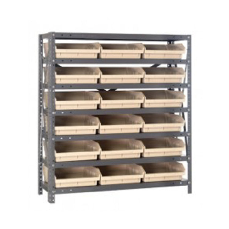 The Quantum 1839-110 Shelving Unit is an expertly designed storage solution, measuring 18 inches in depth, 36 inches in length, and 39 inches in height. Engineered for heavy-duty applications, each shelf boasts a robust load capacity of 400 pounds, providing reliable support for a wide range of stored items. This unit includes seven shelves, ensuring ample storage space, along with 18 bins sized at 17-7/8 inches in length, 11-1/8 inches in width, and 4 inches in height (QSB110). These bins are available in multiple colors, offering customizable organization options to suit various aesthetic preferences and functional needs. The shelving unit is constructed with a galvanized steel finish, ensuring durability and resistance to corrosion, making it suitable for demanding environments. It features sturdy uprights and cross bars that add to the stability and longevity of the unit. The Quantum 1839-110 Shelving Unit is ideal for industrial settings, warehouses, or any location requiring dependable storage capabilities. Its combination of high load capacity, customizable bin options, and durable construction provides a versatile and efficient storage solution for diverse market segments, including manufacturing, retail, and logistics industries.