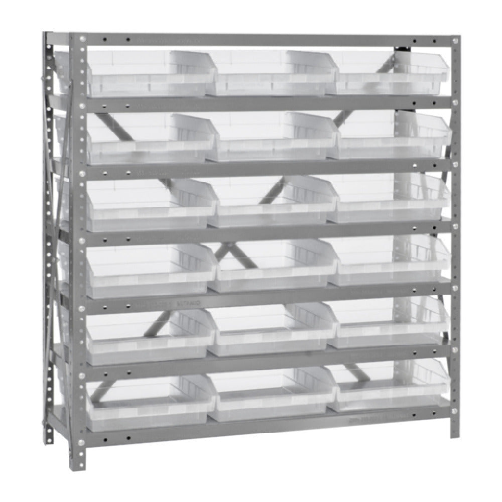 The Quantum 1839-110CL Shelving Unit is a heavy-duty storage solution designed for robust applications across various industries. Measuring 18 inches in depth, 36 inches in length, and 39 inches in height, this unit boasts exceptional load-bearing capacity, supporting up to 400 lbs per shelf. Constructed with galvanized steel, it offers superior durability and resistance to corrosion, making it ideal for demanding environments. The shelving unit includes seven shelves, providing ample storage space for diverse needs. Additionally, it comes equipped with 18 clear bins, each measuring 17-7/8 inches in length, 11-1/8 inches in width, and 4 inches in height, allowing for organized and accessible storage of smaller items. The inclusion of uprights and cross bars ensures structural integrity and stability. This shelving unit is particularly beneficial for warehouses, manufacturing facilities, and retail environments, where efficient space utilization and robust storage solutions are critical. The clear bins offer visibility of contents, enhancing operational efficiency by facilitating quick identification and retrieval of items. The Quantum 1839-110CL Shelving Unit represents a blend of practicality and strength, making it a valuable addition to any professional setting requiring reliable and adaptable storage capabilities.