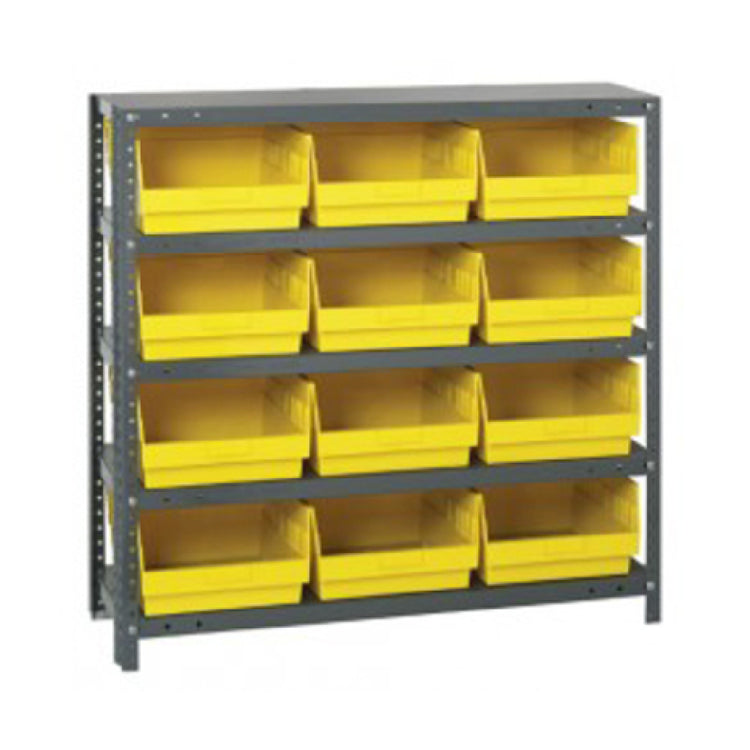 The Quantum 1839-210 Shelving Unit 18"D X 36"L X 39"H Heavy Duty is a robust storage solution designed to meet the demands of various industries requiring reliable shelving. With a substantial load capacity of 400 lb. per shelf, this unit is equipped to support heavy items with ease. The shelving unit includes five durable shelves, ensuring ample storage space. Additionally, it comes with twelve QSB210 bins, each measuring 17-7/8"L x 11-1/8"W x 6"H, offering flexible storage options and available in multiple colors to suit organizational needs. This adds a level of customization and efficiency for environments such as warehouses, garages, and workshops where sorting and easy access are critical. The unit's construction features uprights and cross bars, ensuring structural integrity, while the galvanized steel finish provides enhanced durability and resistance to corrosion, making it suitable for both industrial and commercial settings. Measuring 18 inches in depth, 36 inches in length, and 39 inches in height, the Quantum 1839-210 Shelving Unit is engineered to fit within a variety of spatial constraints, providing a versatile storage solution that effectively maximizes space while maintaining stability and strength.