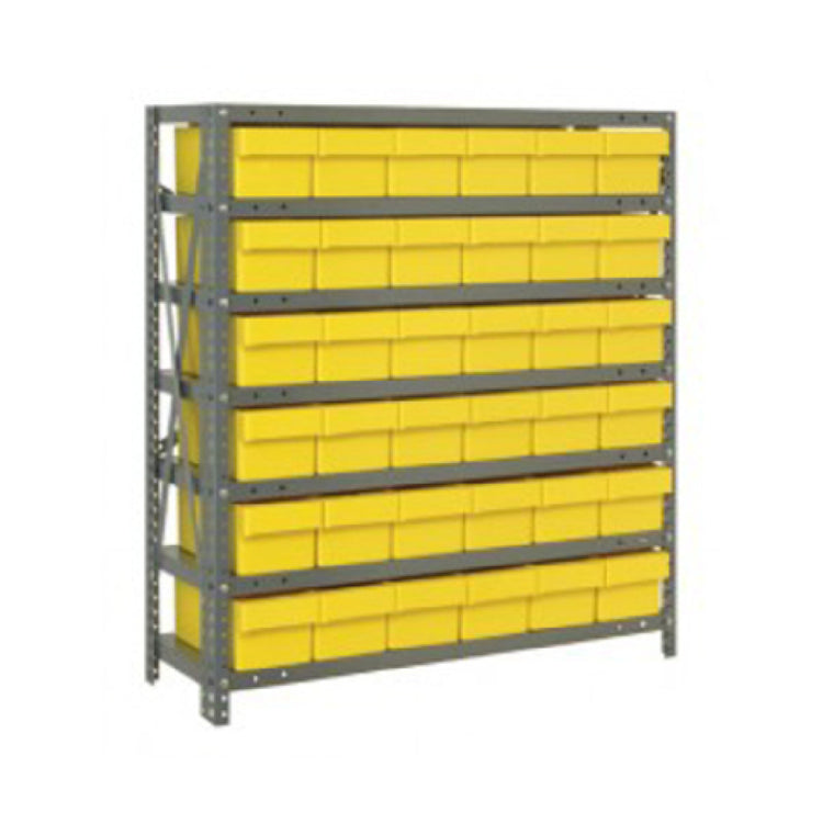 The Quantum 1839-602 Shelving Unit is a heavy-duty storage solution with the dimensions of 18"D x 36"L x 39"H, tailored for industrial and commercial spaces requiring robust shelving. This shelving unit stands out with its impressive 400 lb. load capacity per shelf, ensuring reliable support for a variety of items. The unit includes seven shelves, providing ample organizational space for diverse storage needs. Accompanying the shelves are thirty-six bins, each measuring 17-7/8"L x 5-9/16"W x 4-5/8"H, identified as model QED602, which are available in multiple color options to suit different aesthetic preferences or organizational systems. The sturdy construction is highlighted by its galvanized steel finish, offering durability and resistance to corrosion, making it suitable for harsh environments. The shelving unit also includes uprights and cross bars, enhancing the structural integrity and stability of the unit, ensuring it withstands rigorous use. The Quantum 1839-602 Shelving Unit represents a versatile storage asset for warehouses, workshops, garages, and other facilities requiring dependable shelving solutions that prioritize load capacity and structural resilience.