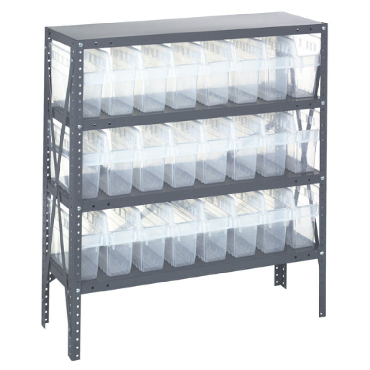 The Quantum 1839-SB803CL Shelving Unit 18"D x 36"L x 39"H Heavy Duty is a robust storage solution designed for industries requiring substantial load capacities and organized storage. Each of its four shelves can bear a load of up to 400 pounds, making it suitable for heavy-duty applications. This shelving unit is accompanied by 24 clear bins (QSB803), each measuring 17-7/8"L x 4-3/8"W x 8"H, providing a versatile and transparent storage system that facilitates ease of access and inventory management. Constructed from galvanized steel, the unit ensures durability and resistance to corrosion, ideal for challenging environments where longevity and strength are critical. With a height of 39 inches, it is perfect for spaces that demand vertical storage solutions without compromising accessibility. The inclusion of uprights and cross bars enhances the unit’s stability, offering a reliable framework for various storage needs. This shelving unit is particularly valuable for sectors such as warehousing, retail, manufacturing, and workshops where organization, efficiency, and space optimization are key. The Quantum 1839-SB803CL Shelving Unit stands out for its well-engineered design and functionality, catering to a wide array of market segments that prioritize strength and organization in their operational processes.