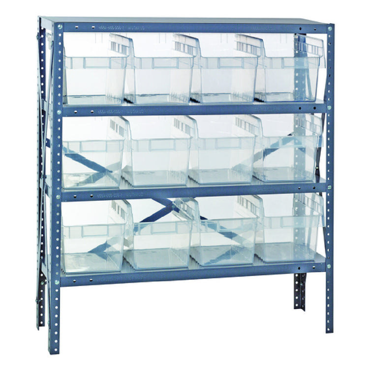 The Quantum 1839-SB808CL Shelving Unit 18"D x 36"L x 39"H Heavy Duty is a premium storage solution designed for demanding environments requiring robust and reliable shelving systems. Each of the four shelves in this unit boasts a substantial load capacity of 400 lbs, making it ideal for industries that prioritize strength and durability. The unit includes twelve 17-7/8"L x 8-3/8"W x 8"H (QSB808) clear bins, offering versatile storage options for a wide range of items. The shelving unit's construction features a galvanized steel finish, ensuring long-lasting resistance to corrosion and wear. This finish not only enhances the unit's durability but also provides a sleek and professional appearance suitable for various commercial settings. With a total height of 39 inches, the Quantum shelving unit is compact enough for smaller spaces while providing ample storage capacity. Its design caters to multiple market segments, including retail, warehousing, and industrial sectors, all of which can benefit from its robust design and exceptional storage capabilities. The easy integration of uprights and cross bars further enhances the structural integrity of this heavy-duty shelving unit, making it a dependable choice for businesses seeking efficient and reliable organizational solutions.