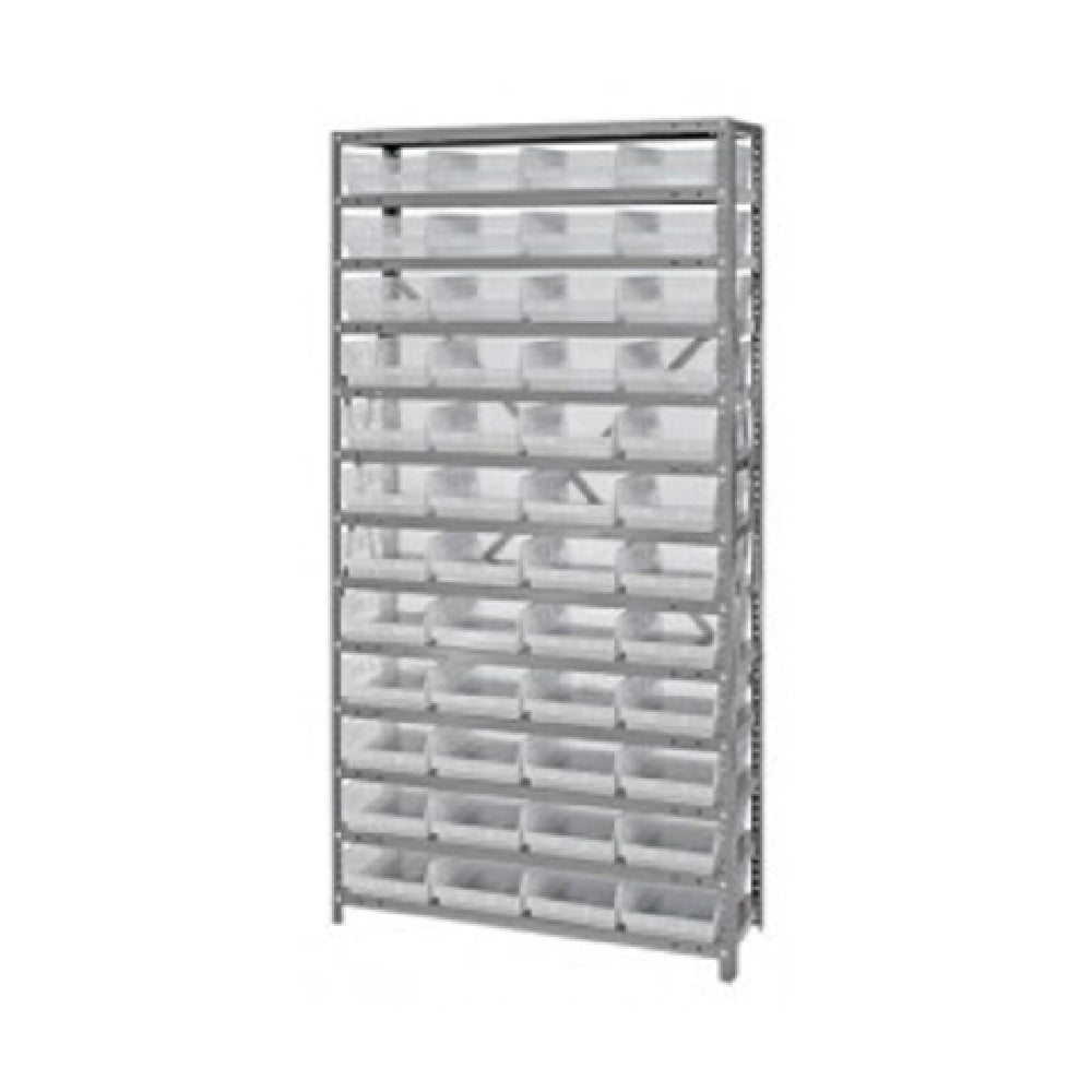 The Quantum 1875-108CL Shelving Unit 18"D x 36"L x 75"H Heavy Duty is a robust storage solution designed for demanding industrial environments. With a 400 lb. load capacity per shelf, this unit is engineered to support substantial weight, making it ideal for warehouses, workshops, and commercial spaces that require reliable storage options. The unit includes 13 shelves, providing ample storage space for a variety of items. Accompanying the shelves are 48 clear bins, each measuring 17-7/8"L x 8-3/8"W x 4"H, designated as QSB108, which allow for organized and visible storage, enhancing accessibility and efficiency. Constructed with a galvanized steel finish, the Quantum 1875-108CL Shelving Unit is built to withstand harsh conditions, offering durability and resistance to corrosion. The inclusion of uprights and cross bars ensures structural integrity and stability. This shelving unit is suited for sectors that require heavy-duty storage solutions, such as manufacturing, logistics, and retail. Its clear bins facilitate easy identification of stored items, making it valuable for environments where quick access to tools, parts, or products is essential. Overall, the Quantum 1875-108CL Shelving Unit combines strength, organization, and durability to meet the rigorous demands of various industrial applications.