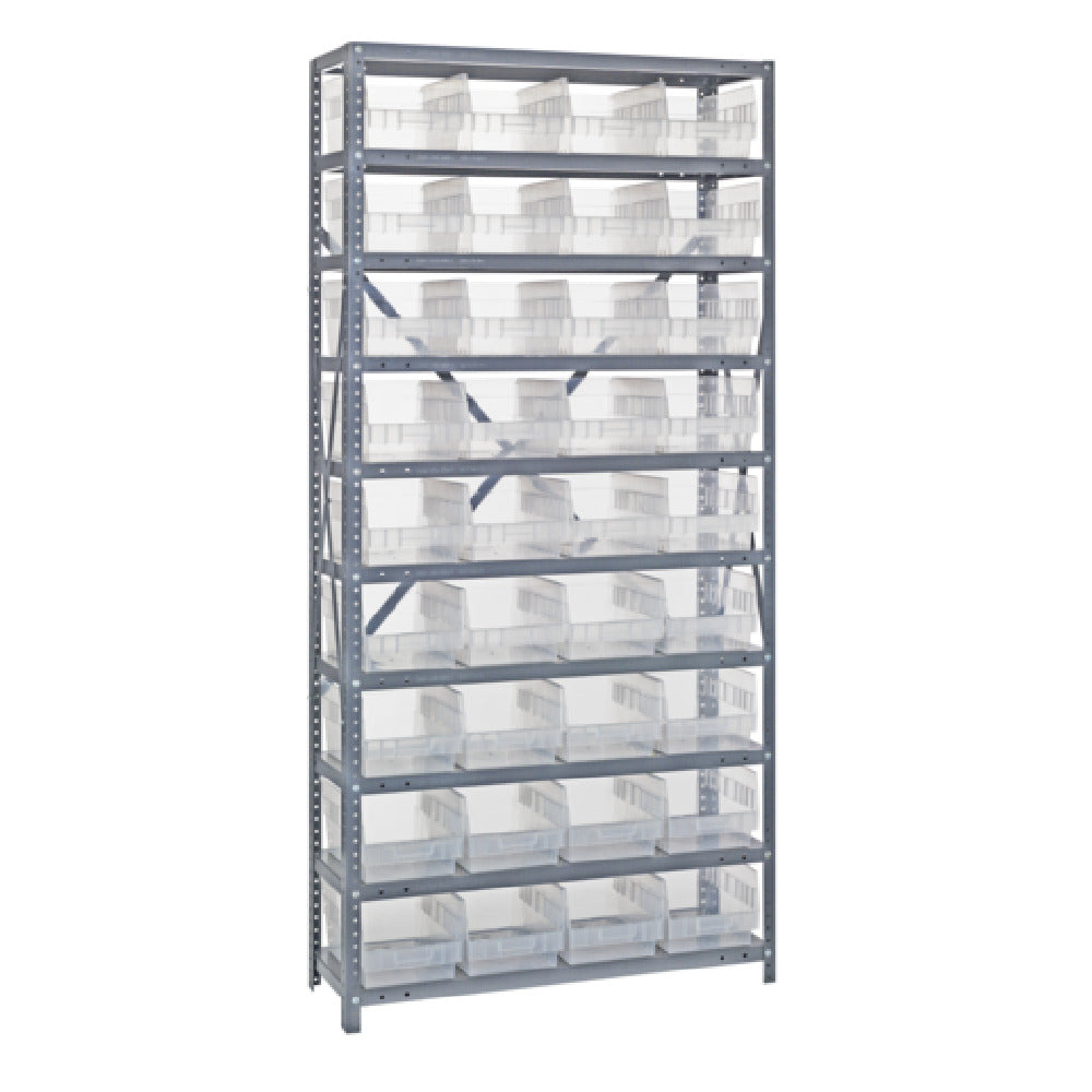 The Quantum 1875-208CL Shelving Unit 18"D X 36"L X 75"H Heavy Duty is a meticulously crafted storage solution designed for industrial-grade shelving needs. This robust unit boasts a load capacity of 400 lb. per shelf, making it suitable for various sectors requiring heavy-duty storage. Featuring 13 shelves, this unit is engineered with a galvanized steel finish, ensuring durability and resistance to corrosion. The shelving unit's dimensions are 18 inches in depth, 36 inches in length, and 75 inches in height, providing ample vertical storage space within a compact horizontal footprint. Complementing its structural integrity, the unit includes 36 clear bins, each measuring 17-7/8 inches in length, 8-3/8 inches in width, and 4 inches in height (QSB208), allowing for organized and accessible storage of smaller items. The inclusion of uprights and cross bars further enhances the unit's stability and load-bearing capabilities. The Quantum 1875-208CL Shelving Unit is designed to meet the rigorous standards of various industries, from warehousing to retail, where efficient space utilization and reliable performance are paramount.