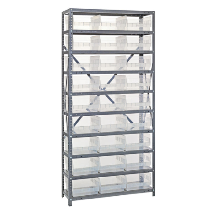 The Quantum 1875-210CL Shelving Unit is a heavy-duty storage solution designed for industries requiring robust organizational systems. Measuring 18 inches in depth, 36 inches in length, and 75 inches in height, it provides ample space for storing a wide variety of items. Each shelf boasts a remarkable 400-pound load capacity, ensuring that it can support heavy items without compromising structural integrity. This unit includes 13 shelves and features 27 clear bins, each measuring 17-7/8 inches in length, 11-1/8 inches in width, and 4 inches in height, specifically QSB210 model bins. These clear bins allow for easy visibility of contents, making organization and retrieval efficient and straightforward. The shelving unit is constructed with galvanized steel, offering enhanced durability and resistance to rust and corrosion, making it suitable for both industrial and commercial environments. The package includes uprights and cross bars, providing additional stability to the overall structure. This shelving unit is ideal for various segments within industries such as warehousing, manufacturing, and retail, where efficient space utilization and heavy-duty storage capabilities are paramount. By integrating this unit, businesses can maximize their storage capacity while maintaining an organized and accessible inventory system.