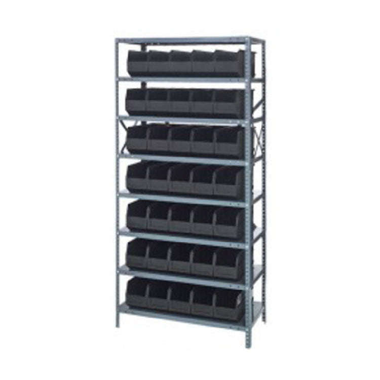 The Quantum 1875-461 Shelving Unit is a heavy-duty storage solution measuring 18"D x 36"L x 75"H, engineered to meet the demands of various industries with its robust construction. It boasts a substantial load capacity of 400 lb. per shelf, making it suitable for environments requiring reliable and strong storage options. This unit includes eight shelves, providing ample storage space for a multitude of items. Additionally, the package comprises thirty-five bins, each measuring 18"L x 6"W x 7"H (SSB461), which are available in multiple colors, allowing for organizational versatility. Constructed with a galvanized steel finish, the Quantum shelving unit promises durability and resistance to wear and tear in demanding settings. The inclusion of uprights and cross bars ensures enhanced stability and support, distinguishing it as a dependable choice for sectors such as warehousing, manufacturing, and retail. The thoughtful design caters to diverse storage requirements while maximizing space efficiency and providing a customizable organizational system. This shelving unit is an excellent investment for businesses seeking a resilient and adaptable storage solution that harmonizes strength with practicality.