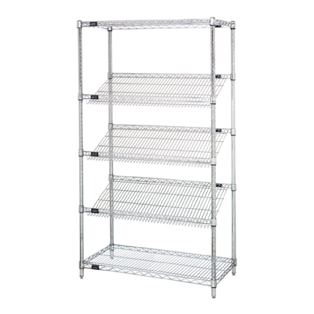 The Quantum 2448SL6C Slanted Shelving Unit Stationary 48"W x 24"D x 63"H is a versatile storage solution designed to meet the needs of various industries requiring organized shelving. Measuring a spacious 48 inches in width, 24 inches in depth, and 63 inches in height, this stationary unit combines functionality with a sleek design. It includes two flat wire shelves for stable storage and three slanted wire shelves which are particularly beneficial for easy access and display, making it ideal for retail environments or warehouses. The unit stands firmly on four 63-inch posts, ensuring stability and durability. Finished with a chrome-plated coating, it not only offers a visually appealing aesthetic but also enhances corrosion resistance, extending the product's longevity in demanding settings. Its compliance with NSF standards highlights its suitability for use in food-related industries, ensuring hygiene and safety. Whether for retail, food service, or storage and distribution centers, the Quantum 2448SL6C delivers with its robust construction and adaptable configuration, providing an invaluable addition to any professional environment needing efficient, accessible, and reliable shelving.