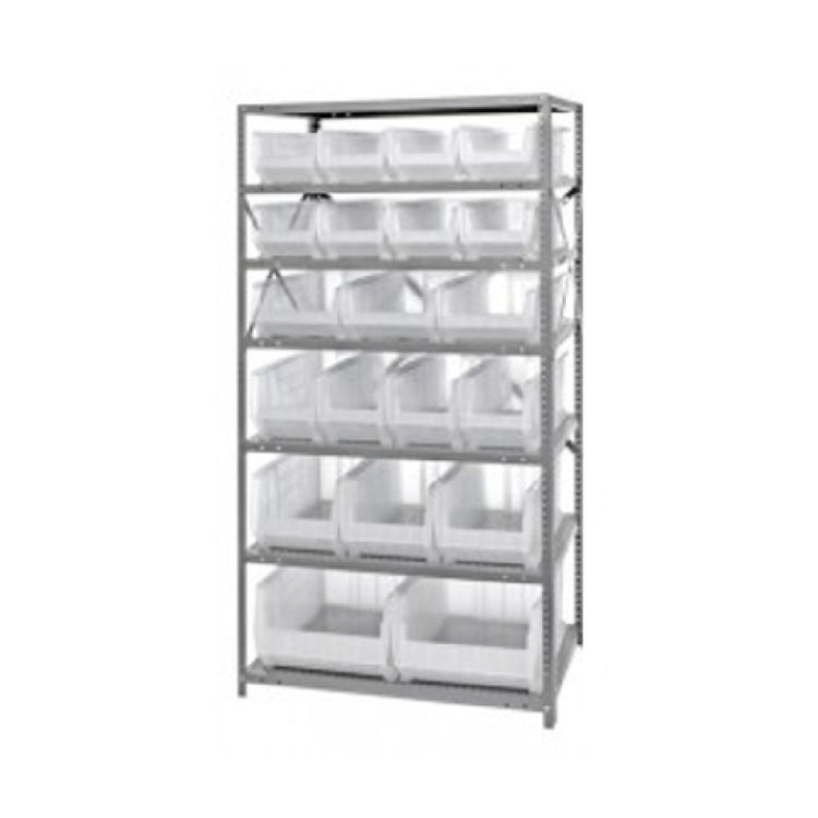 The Quantum 2475-20-MIXCL Shelving Unit 24"D X 36"L X 75"H Heavy Duty is expertly designed for industrial strength storage with its robust 400 lb. load capacity per shelf. This unit features seven durable shelves, making it an ideal solution for various storage needs across different industry sectors. Constructed with a galvanized steel finish, it ensures long-lasting durability and resistance to wear and tear. The shelving unit comes with a comprehensive set of clear bins- (8) 23-7/8"L x 8-1/4"W x 7"H (QUS950), (3) 23-7/8"L x 11"W x 7"H (QUS952), (4) 23-7/8"L x 8-1/4"W x 9"H (QUS951), (3) 23-7/8"L x 11"W x 10"H (QUS953), and (2) 23-7/8"L x 16-1/2"W x 11"H (QUS954), providing versatile storage options for items of different sizes. The inclusion of uprights and cross bars adds to the structural integrity and stability of the unit, ensuring it can meet the rigorous demands of industrial or commercial environments. This shelving unit is an excellent choice for businesses in need of efficient, space-maximizing solutions, whether in warehouses, workshops, or retail settings, thanks to its combination of strength, versatility, and capacity.