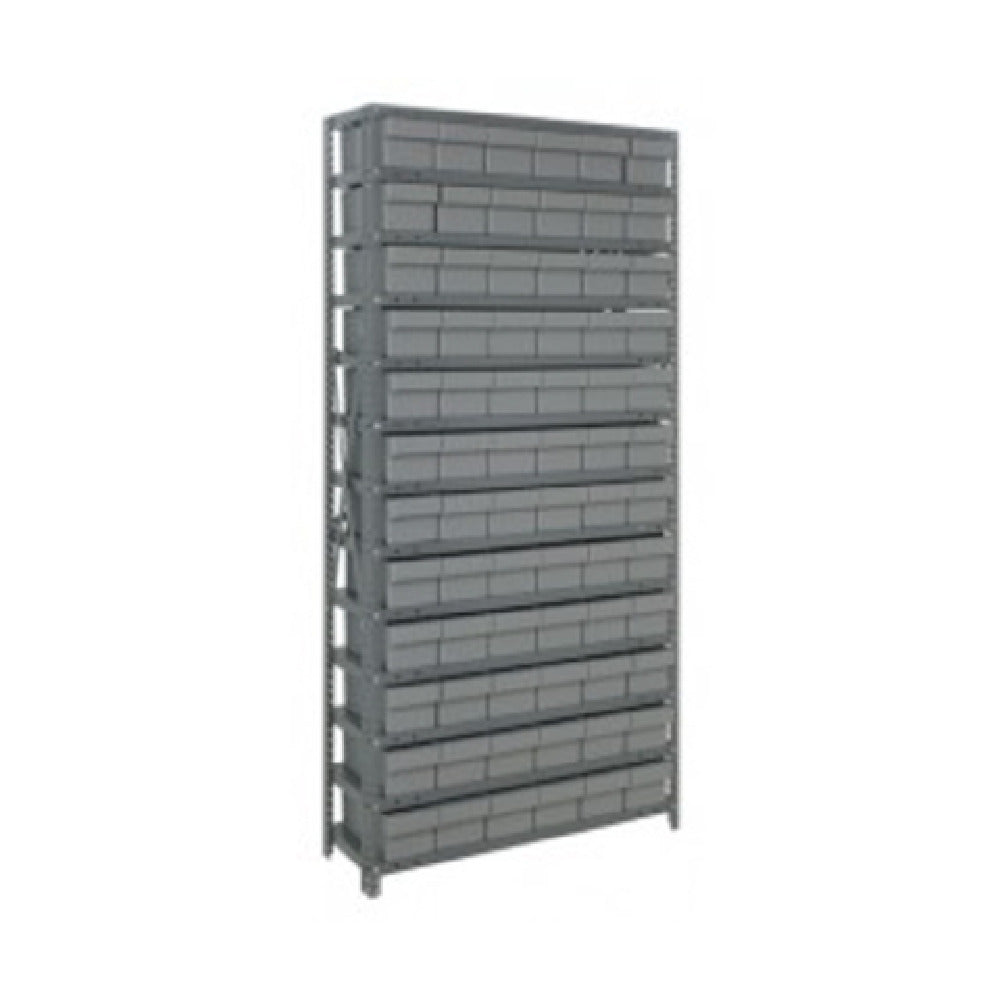 The Quantum 2475-603 Shelving Unit, measuring 24"D x 36"L x 75"H, is designed to meet the needs of various industries requiring robust storage solutions. With a heavy-duty build, each of its 13 shelves boasts an impressive load capacity of 400 lb., making it suitable for demanding environments. The unit includes 72 bins, measuring 24"L x 5-9/16"W x 4-5/8"H (QED603), which come in multiple color options, providing customizable organization and easy identification of stored items. Constructed with a galvanized steel finish, the shelving unit offers enhanced durability and resistance to corrosion, making it ideal for industrial, commercial, and warehouse settings. The inclusion of uprights and crossbars further reinforces the unit's stability, ensuring a long-lasting and reliable storage solution. The Quantum 2475-603 Shelving Unit is specifically engineered to offer exceptional support and storage capacity, accommodating a variety of materials and tools, making it a valuable asset for sectors such as manufacturing, retail, and logistics that require efficient space management. Its design emphasizes both functionality and adaptability, catering to diverse storage needs while maintaining a professional and organized appearance in any workspace.