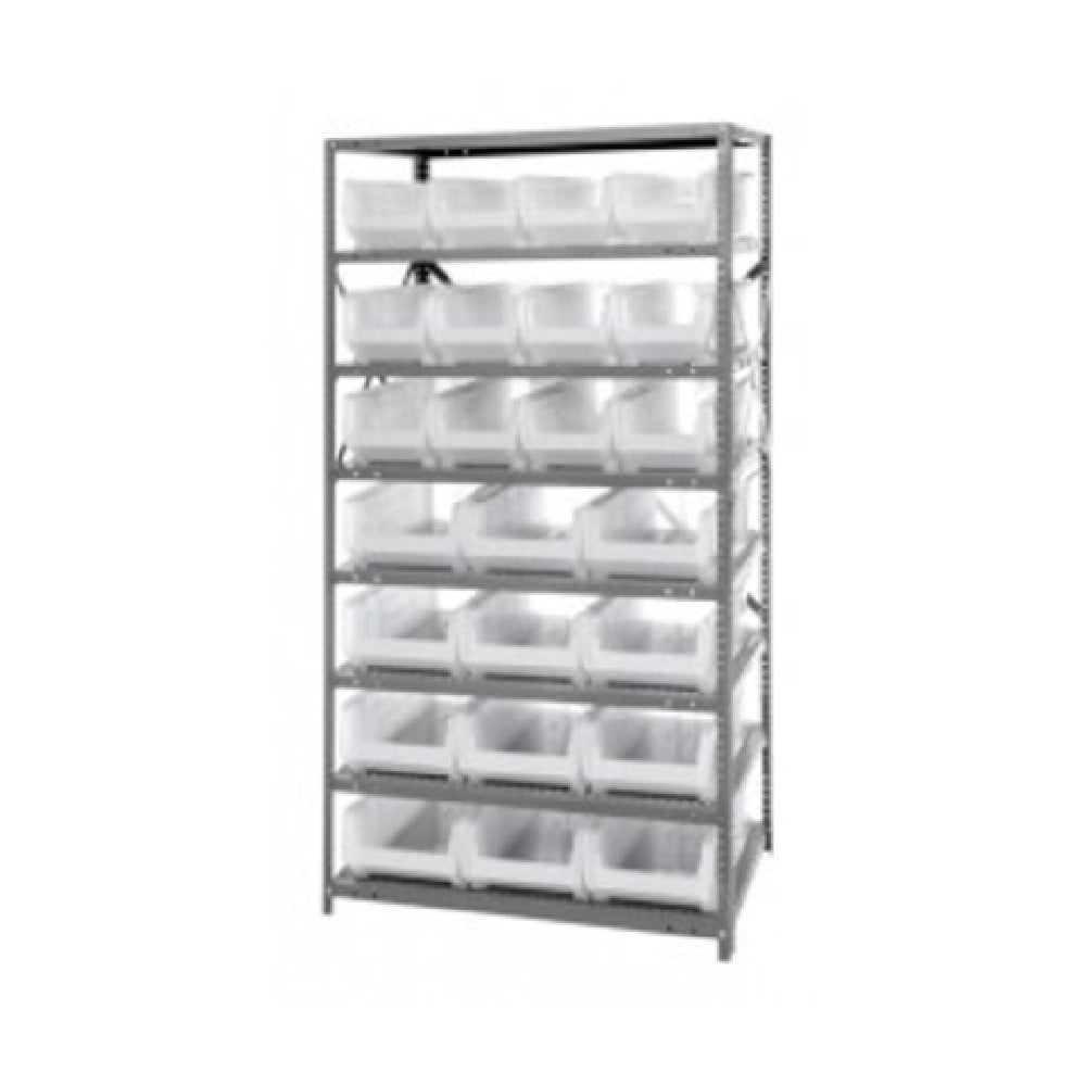 The Quantum 2475-950952CL Shelving Unit 24"D X 36"L X 75"H Heavy Duty is a versatile storage solution designed to meet the demanding needs of various industry sectors. With a substantial load capacity of 400 lb per shelf, this shelving unit can support an impressive amount of weight, making it an ideal choice for warehouses, industrial facilities, and commercial spaces requiring robust storage capabilities. The unit includes eight shelves, providing ample space for organizing and storing a wide variety of items. It comes equipped with (12) 23-7/8"L x 8-1/4"W x 7"H (QUS950) and (12) 23-7/8"L x 11"W x 7"H (QUS952) clear bins, offering organized visibility and quick access to stored contents. The shelving unit's construction incorporates uprights and cross bars, enhancing structural integrity, while its galvanized steel finish ensures durability and resistance to corrosion, suitable for both indoor and outdoor environments. The thoughtful design and extensive technical specifications of the Quantum 2475-950952CL Shelving Unit make it a valuable asset across multiple sectors seeking reliable, heavy-duty storage solutions.