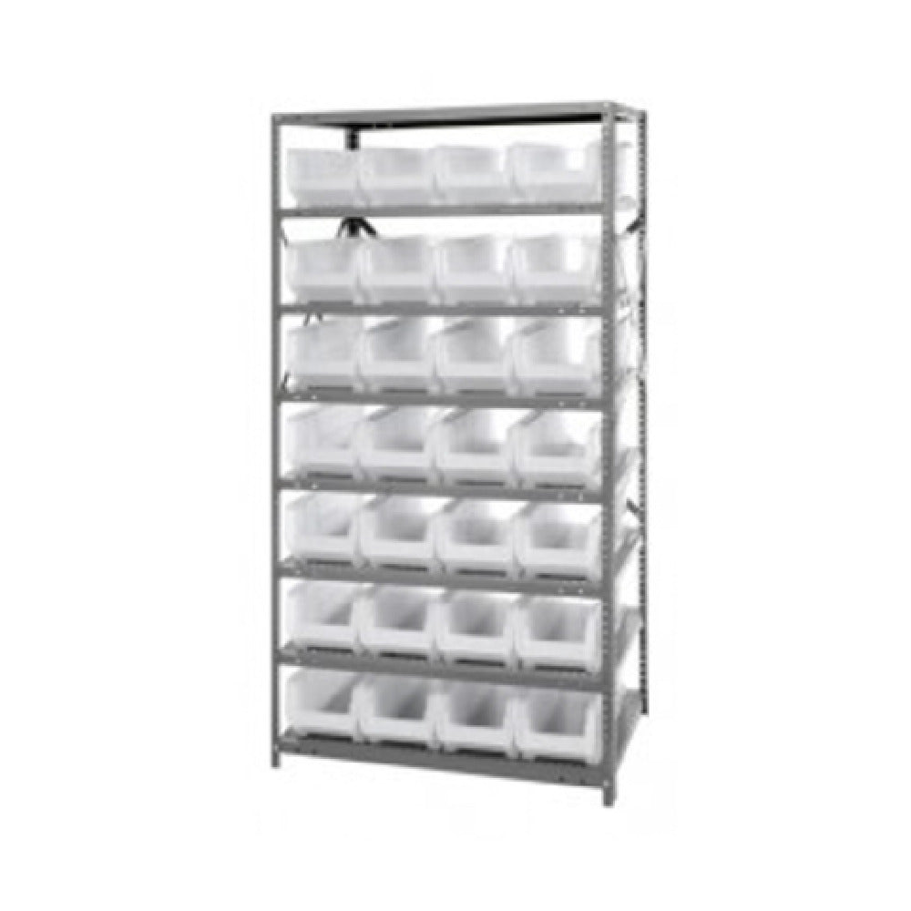 The Quantum 2475-950CL Shelving Unit is a heavy-duty storage solution measuring 24"D x 36"L x 75"H, engineered to meet the demanding needs of various industrial sectors. Each shelf boasts an impressive load capacity of 400 lbs, ensuring robust support for a wide range of goods. This unit comes complete with eight shelves, providing ample space for organization and efficiency. Additionally, it includes 28 clear bins, each measuring 23-7/8"L x 8-1/4"W x 7"H, offering convenient storage and easy visibility of contents. The construction features uprights and crossbars, contributing to its stability and durability. Finished with galvanized steel, this shelving unit is designed to withstand challenging environments and resist corrosion. The Quantum 2475-950CL Shelving Unit's design makes it an ideal choice for warehouses, manufacturing facilities, and other industrial settings where reliable and efficient storage is paramount. Its versatility and strength are complemented by its thoughtful inclusion of clear bins, which streamline inventory management and accessibility. This shelving unit represents a strategic investment for organizations seeking to optimize their storage capabilities while maintaining a high standard of durability and functionality.