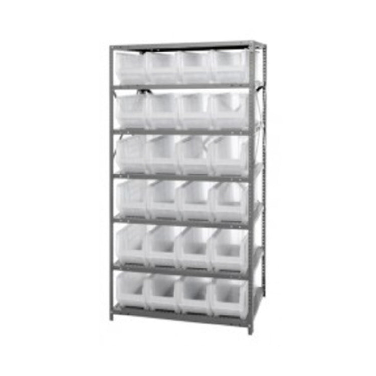 The Quantum 2475-951CL Shelving Unit is a high-capacity heavy-duty storage solution perfect for industries demanding robust organization and storage efficiency. This shelving unit, measuring 24 inches in depth, 36 inches in length, and 75 inches in height, is engineered with a formidable load capacity of 400 pounds per shelf, ensuring durability and reliability across various applications. It includes eight shelves and is accompanied by 24 clear bins, each with dimensions of 23-7/8 inches in length, 8-1/4 inches in width, and 9 inches in height (QUS951), providing versatile storage options for small to medium-sized items. The galvanized steel finish of the Quantum 2475-951CL Shelving Unit not only offers a sleek aesthetic but also enhances the unit's resistance to corrosion, making it suitable for use in demanding environments. Uprights and cross bars further stabilize the structure, ensuring that the unit maintains its integrity under full load. These features collectively make this shelving unit a strategic choice for warehouses, manufacturing plants, and retail environments requiring reliable, heavy-duty shelving solutions that prioritize both capacity and durability.
