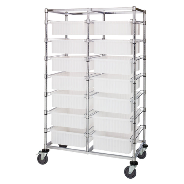 The Quantum BC214069M1DCL Bin Cart Mobile Double Bay is a meticulously designed storage solution crafted for versatility and efficiency across various industrial segments. This mobile bin cart features a double bay structure, providing ample organization space with its dimensions of 24 inches in width, 40 inches in length, and 69 inches in height. It includes fourteen clear bins, each measuring 22-1/2 inches in length, 17-1/2 inches in width, and 6 inches in height (DG93060), offering substantial storage capacity while maintaining easy visibility of contents. The bin cart's chrome-plated finish ensures durability and a sleek appearance, making it suited for environments where both aesthetic and functionality are valued. Shipped in a KD (knock-down) format, it facilitates simplified assembly and transport, catering to the needs of businesses or operations requiring adaptable storage solutions. This cart is particularly advantageous for industries looking to optimize space and streamline organization, whether in a workshop, warehouse, or retail setting. Its mobility further enhances its practicality, allowing for effortless relocation as operational demands change. The Quantum BC214069M1DCL Bin Cart stands out as a reliable and efficient tool for maintaining systematic storage and access to materials.