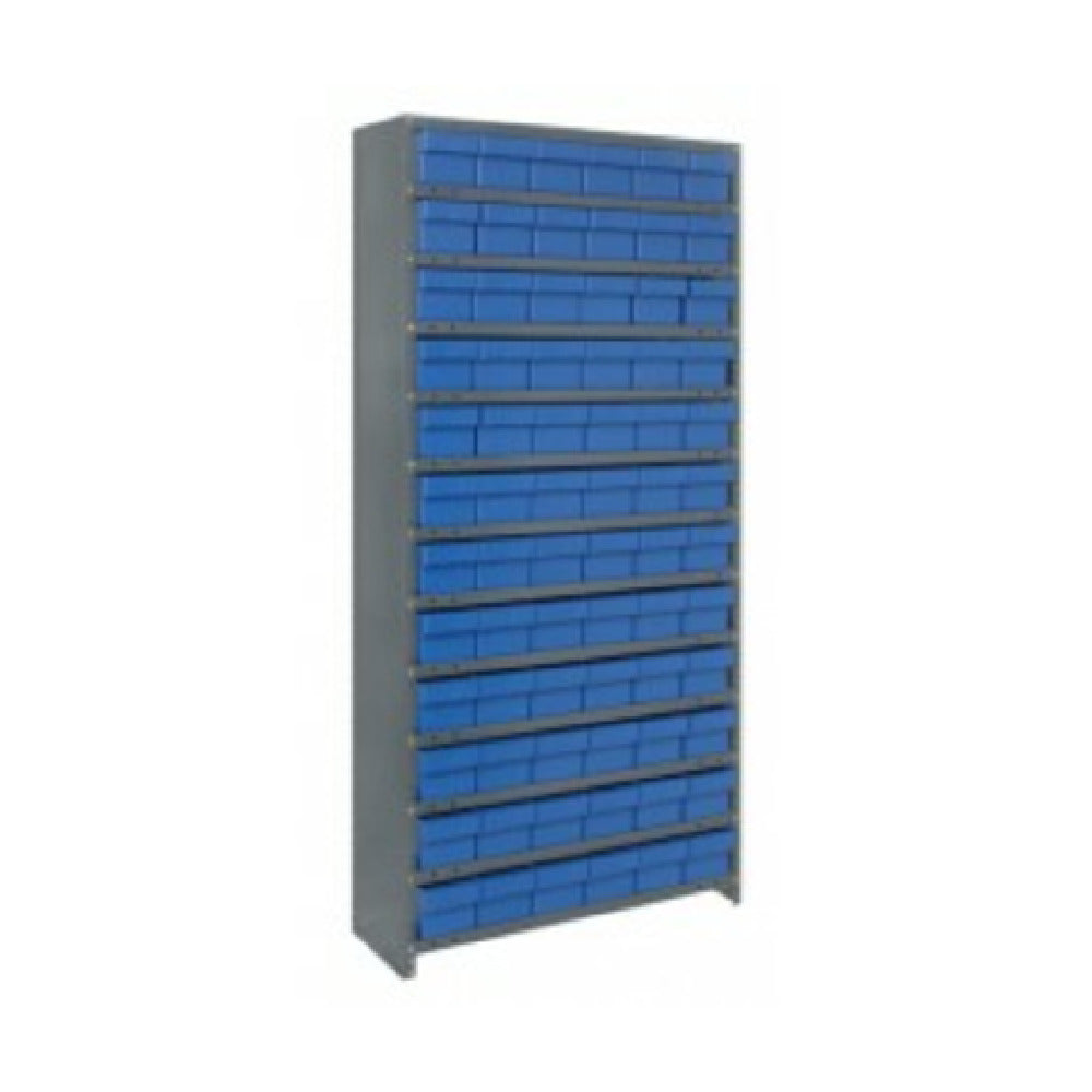 The Quantum CL1275-601 Shelving Unit is a closed, heavy-duty storage solution measuring 12"D x 36"L x 75"H. It is engineered to support a substantial load capacity of 400 lb per shelf, making it an exceptional choice for warehouses and industrial environments requiring robust and reliable storage. This unit comes with 13 shelves, providing ample space for diverse storage needs. Additionally, it includes 72 bins, each measuring 11-5/8"L x 5-9/16"W x 4-5/8"H, identified by the model number QED601, and available in multiple colors to suit organizational preferences. The Quantum CL1275-601 features sturdy uprights and cross bars, enhancing its structural integrity. The smooth powder coat finish not only adds a layer of durability but also offers a sleek, professional appearance, suitable for a variety of industrial and commercial settings. This shelving unit caters to different market segments within the industry by providing a combination of high load capacity and versatile bin storage, optimizing space usage and inventory management effectively.