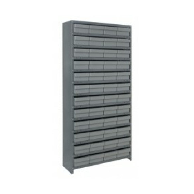 The Quantum CL1275-701 Shelving Unit is a closed storage solution designed to maximize efficiency and organization in diverse industrial settings. With dimensions of 12"D x 36"L x 75"H, this unit is engineered for heavy-duty use, boasting a substantial load capacity of 400 lb. per shelf. It includes 13 shelves, providing ample space for various storage needs. This unit also features 48 bins, each measuring 11-5/8"L x 8-3/8"W x 4-5/8"H, available in multiple colors, enhancing organizational capabilities. Built with sturdy uprights and cross bars, the shelving unit offers reliable support and stability. The smooth powder coat finish not only adds a sleek appearance but also provides added durability and protection against wear and tear. This shelving unit is particularly valuable for industries requiring robust storage solutions, such as warehouses, workshops, and manufacturing facilities, where heavy materials and components are frequently handled. Its closed design ensures items are securely stored, minimizing the risk of loss or damage, while the customizable bin colors allow for easy categorization and retrieval of stored items. The Quantum CL1275-701 Shelving Unit stands as a versatile and durable choice, meeting the demanding storage requirements of various professional environments.
