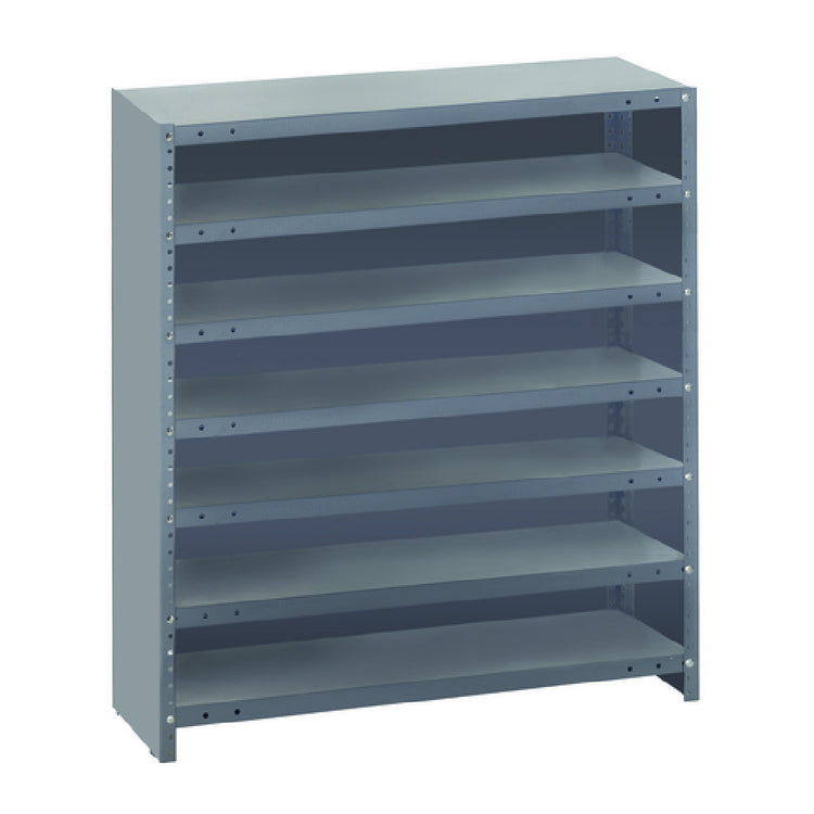 The Quantum CL1839-000 Shelving Unit is a robust and heavy-duty storage solution, distinguished by its practical dimensions of 18"D x 36"L x 39"H. This closed shelving unit is engineered to accommodate demanding storage requirements with a substantial load capacity of 400 lb. per shelf, making it a reliable choice for various industrial and commercial applications. It features seven durable shelves, supported by sturdy uprights and cross bars, providing ample space for organized storage. The unit's sleek and smooth powder coat finish not only enhances its aesthetic appeal but also offers additional durability and resistance to wear and tear. Designed for optimal functionality across different market segments within the industry, the Quantum CL1839-000 Shelving Unit is ideal for environments where robust and efficient storage is critical. Whether used in warehouses, workshops, or retail spaces, this shelving unit guarantees a high degree of reliability and longevity, catering effectively to the storage needs of diverse industries.