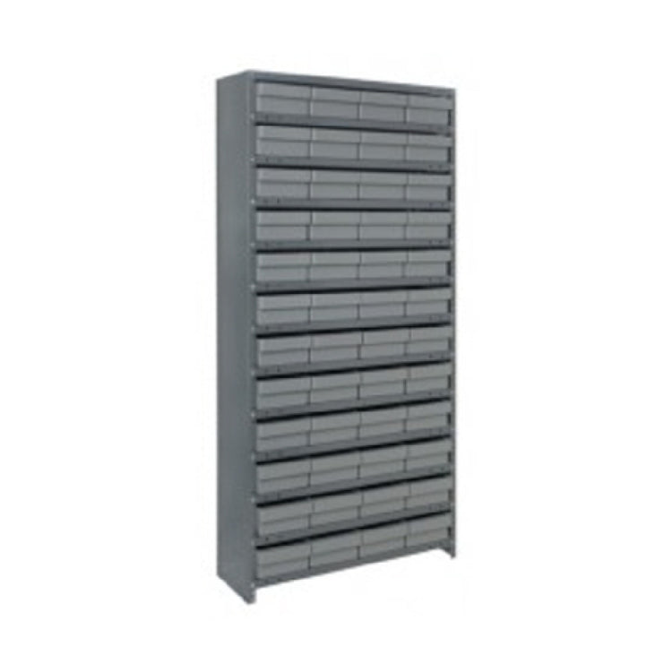 The Quantum CL1875-606 Shelving Unit is a closed, heavy-duty storage solution designed for various industrial and commercial applications. With dimensions of 18"D x 36"L x 75"H, this versatile unit provides substantial storage capabilities. Each of its 13 shelves supports a remarkable load capacity of 400 lbs, accommodating a wide range of goods and materials. The unit includes 48 bins, each measuring 17-7/8"L x 8-3/8"W x 4-5/8"H (QED606), available in multiple colors, catering to organizational needs across different industries. The shelving unit is equipped with uprights and cross bars, ensuring stability and strength. Its smooth powder coat finish offers a sleek appearance and enhances durability, making it suitable for settings that demand robust storage solutions. The Quantum CL1875-606 is ideal for warehouses, workshops, and retail environments where reliable and efficient storage is paramount. Its thoughtful design supports easy installation and maintenance, while the availability of multiple bin colors allows for customized organization. Whether used in a commercial warehouse or a smaller storage facility, this shelving unit represents a reliable choice for those prioritizing strength, flexibility, and capacity in their storage solutions.