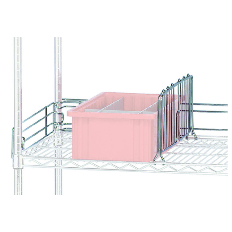 The Quantum DIV18 Wire Shelf Divider is a precision-crafted storage solution, measuring 18 inches in depth and 8 inches in height, designed to optimize organizational efficiency across various industrial sectors. Its chrome-plated finish enhances durability and provides a sleek, professional appearance, ensuring both functionality and aesthetic appeal. This wire shelf divider is engineered to fit seamlessly within existing shelving systems, offering customizable storage options for a range of applications, from retail environments to warehouse settings. The robust construction of the Quantum DIV18 ensures reliable performance, supporting the orderly arrangement of products or materials while maximizing available storage space. Its dimensions make it an ideal choice for environments requiring segmented storage without compromising on accessibility or visibility. The chrome plating not only adds to its durability but also makes it resistant to corrosion, a critical feature in maintaining longevity in demanding environments. The Quantum DIV18 Wire Shelf Divider is an essential component for businesses seeking to enhance organizational systems with modular, adaptable solutions. Its technical specifications, including precise measurements and high-quality materials, underscore its value in delivering efficient, tailored storage configurations in professional settings, making it an indispensable tool for optimizing space management.
